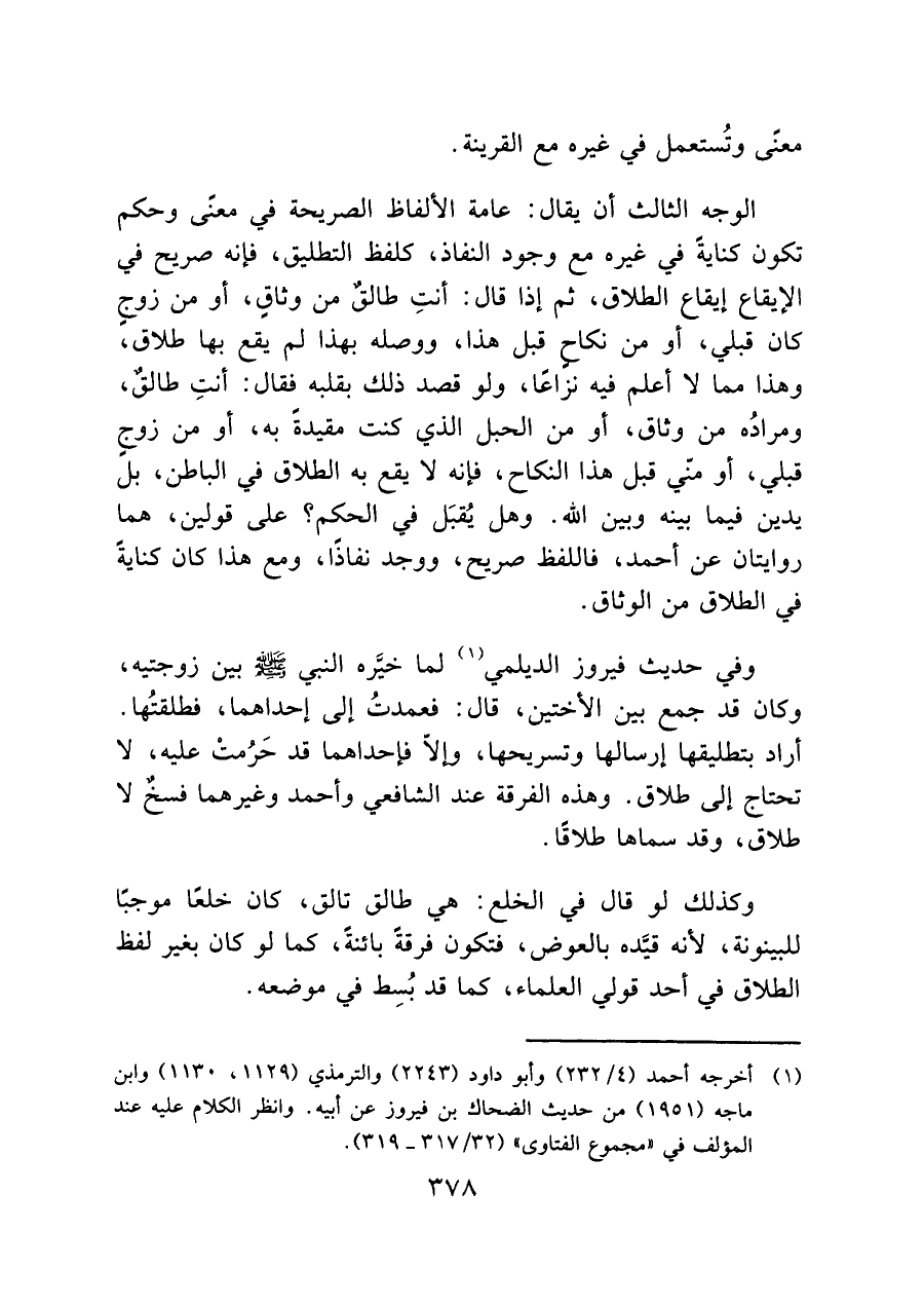 الوجه الثالث أن يقال: عامة الألفاظ الصريحة في معنًى وحكم تكون كنايةً في غيره مع وجود النفاذ، كلفظ التطليق، فإنه صريح في الإيقاع إيقاع الطلاق، ثم إذا قال: أنتِ طالقٌ من وثاقٍ، أو من زوجٍ كان قبلي، أو من نكاح قبل هذا، ووصله بهذا لم يقع بها طلاق، وهذا مما لا أعلم فيه نزاعًا، ولو قصد ذلك بقلبه فقال: أنتِ طالق، ومرادُه من وثاق، أو من الجبل الذي كنت مقيدةً به، أو من زوج قبلي، أو منّي قبل هذا النكاح، فإنه لا يقع به الطلاق في الباطن، بل يدين فيما بينه وبين الله. وهل يُقبَل في الحكم؟ على قولين، هما روايتان عن أحمد، فاللفظ صريح، ووجد نفاذًا، ومع هذا كان كنايةً في الطلاق من الوثاق.
