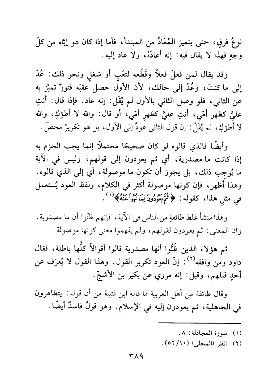 ثم هؤلاء الذين ظَنُّوا أنها مصدرية قالوا أقوالاً كلُّها باطلة، فقال داود ومن وافقه (¬٢): إن العود تكرير القول. وهذا القول لا يُعرَف عن أحدٍ قبلهم، وقيل: إنه مروي عن بكير بن الأشج.