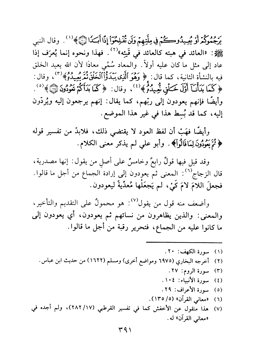 يَرْجُمُوكُمْ أَوْ يُعِيدُوكُمْ فِي مِلَّتِهِمْ وَلَنْ تُفْلِحُوا إِذاً أَبَداً (٢٠)) (¬١). وقال النبي - صَلَّى اللَّهُ عَلَيْهِ وَسَلَّمَ -: "العائد في هبته كالعائد في قَيئه" (¬٢). فهذا ونحوه إنما يُعرَف إذا عاد إلى مثل ما كان عليه أولاً. والمعاد سُمي معادًا لأن الله يعيد الخلق فيه بالنشأة الثانية، كما قال: (وَهُوَ الَّذِي يَبْدأُ الْخَلْقَ ثُمَّ يُعِيدُهُ) (¬٣)، وقال: (كَمَا بَدَأْنَا أَوَّلَ خَلْقٍ نُعِيدُهُ) (¬٤)، وقال: (كَمَا بَدَأَكُمْ تَعُودُونَ (٢٩)) (¬٥).