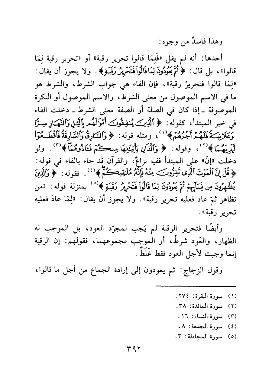 أحدها: أنه لم يقل "فَلِمَا قالوا تحرير رقبة" أو "تحرير رقبة لِمَا قالوا"، بل قال: (ثُمَّ يَعُودُونَ لِمَا قَالُوا فَتَحْرِيرُ رَقَبَةٍ). ولا يجوز أن يقال: "لِمَا قالوا فتحريرُ رقبة"، فإن الفاء هي جواب الشرط، والشرط هو ما في الاسم الموصول من معنى الشرط، والاسم الموصول أو النكرة الموصوفة - إذا كان في الصلة أو الصفة معنى الشرط - دخلت الفاء في خبر المبتدأ، كقوله: (الَّذِينَ يُنْفِقُونَ أَمْوَالَهُمْ بِاللَّيْلِ وَالنَّهَارِ سِرّاً وَعَلانِيَةً فَلَهُمْ أَجْرُهُمْ) (¬١)، ومثله قوله: (وَالسَّارِقُ وَالسَّارِقَةُ فَاقْطَعُوا أَيْدِيَهُمَا) (¬٢)، وقوله: (وَالَّذَانِ يَأْتِيَانِهَا مِنْكُمْ فَآذُوهُمَا) (¬٣). ولو دخلت "إن" على المبتدأ ففيه نزاعٌ، والقرآن قد جاء بالفاء في قوله: (قُلْ إِنَّ الْمَوْتَ الَّذِي تَفِرُّونَ مِنْهُ فَإِنَّهُ مُلاقِيكُمْ) (¬٤). فقوله (وَالَّذِينَ يُظَاهِرُونَ مِنْ نِسَائِهِمْ ثُمَّ يَعُودُونَ لِمَا قَالُوا فَتَحْرِيرُ رَقَبَةٍ) (¬٥) بمنزلة قوله: "من تظاهر ثم عاد فعليه تحرير رقبة". ولا يجوز أن يقال: "لِمَا عادَ فعليه تحرير رقبة".