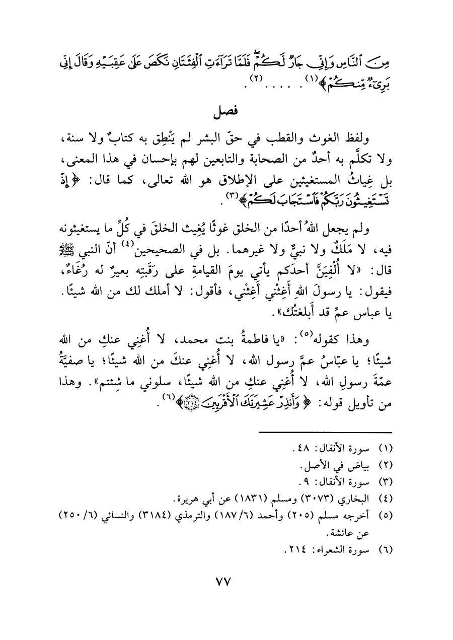ولم يجعل الله أحدًا من الخلق غوثًا يُغِيث الخلقَ في كُلِّ ما يستغيثونه فيه، لا مَلَك ولا نبي ولا غيرهما. بل في الصحيحين (¬٤) أنّ النبي - صَلَّى اللَّهُ عَلَيْهِ وَسَلَّمَ - قال: "لا أُلْفِيَنَّ أحدَكم يأتي يومَ القيامةِ على رَقَبتِه بعيرٌ له رُغَاءٌ، فيقول: يا رسولَ الله أَغِثْني أَغِثْني، فأقول: لا أملك لك من الله شيئًا. يا عباس عمِّ قد أَبلغتك".