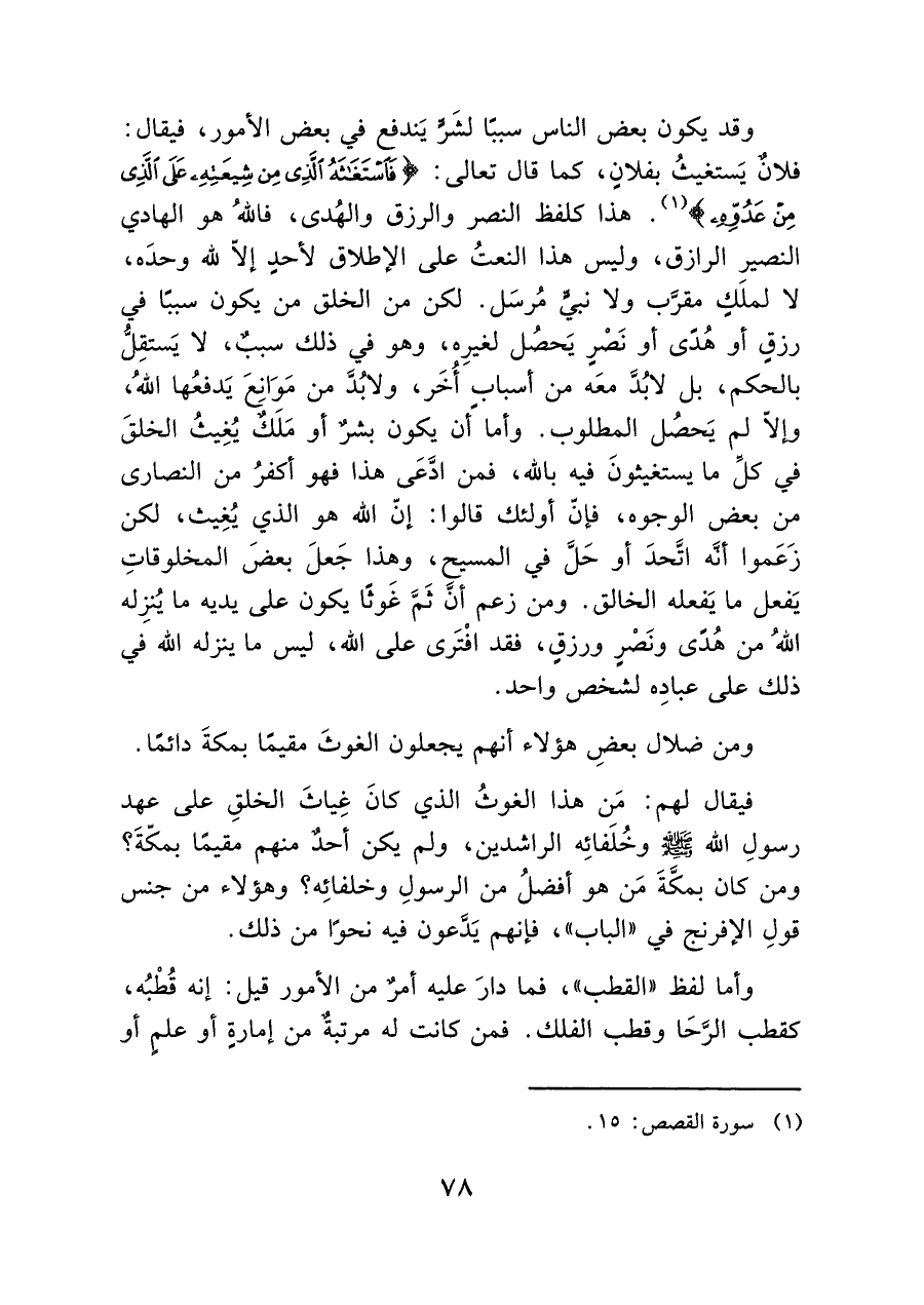 وقد يكون بعض الناس سببَا لشَرٍّ يَندفع في بعض الأمور، فيقال: فلانٌ يَستغيثُ بفلانِ، كما قال تعالى: (فاستغاثه الذي من شيعته على الذي من عدوه) (¬١). هذا كلفظ النصر والرزق والهُدى، فاللهُ هو الهادي النصير الرازق، وليس هذا النعتُ على الإطلاق لأحدِ إلاّ لله وحدَه، لا لملَكٍ مقرَّب ولا نبي مُرسَل. لكن من الخلق من يكون سببًا في رزقِ أو هُدَى أو نَصْرِ يَحصُل لغيرِه، وهو في ذلك سبب، لا يَستقِل بالحكم، بل لابُدَّ معَه من أسباب أُخَر، ولابُدَّ من مَوَانِعَ يَدفعُها اللهُ، وإلاّ لم يَحصُل المطلوب. وأما أَن يكون بشرٌ أو مَلَكٌ يُغِيث الخلقَ في كلِّ ما يستغيثونَ فيه بالله، فمن ادَّعَى هذا فهو أكفرُ من النصارى من بعض الوجوه، فإنّ أولئك قالوا: إنّ الله هو الذي يُغِيث، لكن زَعَموا أنِّه اتَّحدَ أو حَلَّ في المسيح، وهذا جَعلَ بعضَ المخلوقاتِ يَفعل ما يَفعله الخالق. ومن زعم أنَّ ثَمَّ غَوثًا يكون على يديه ما يُنزِله الله من هُدَى ونَصْرِ ورزقِ، فقد افْتَرى على الله، ليس ما ينزله الله في ذلك على عبادِه لشخص واحد.