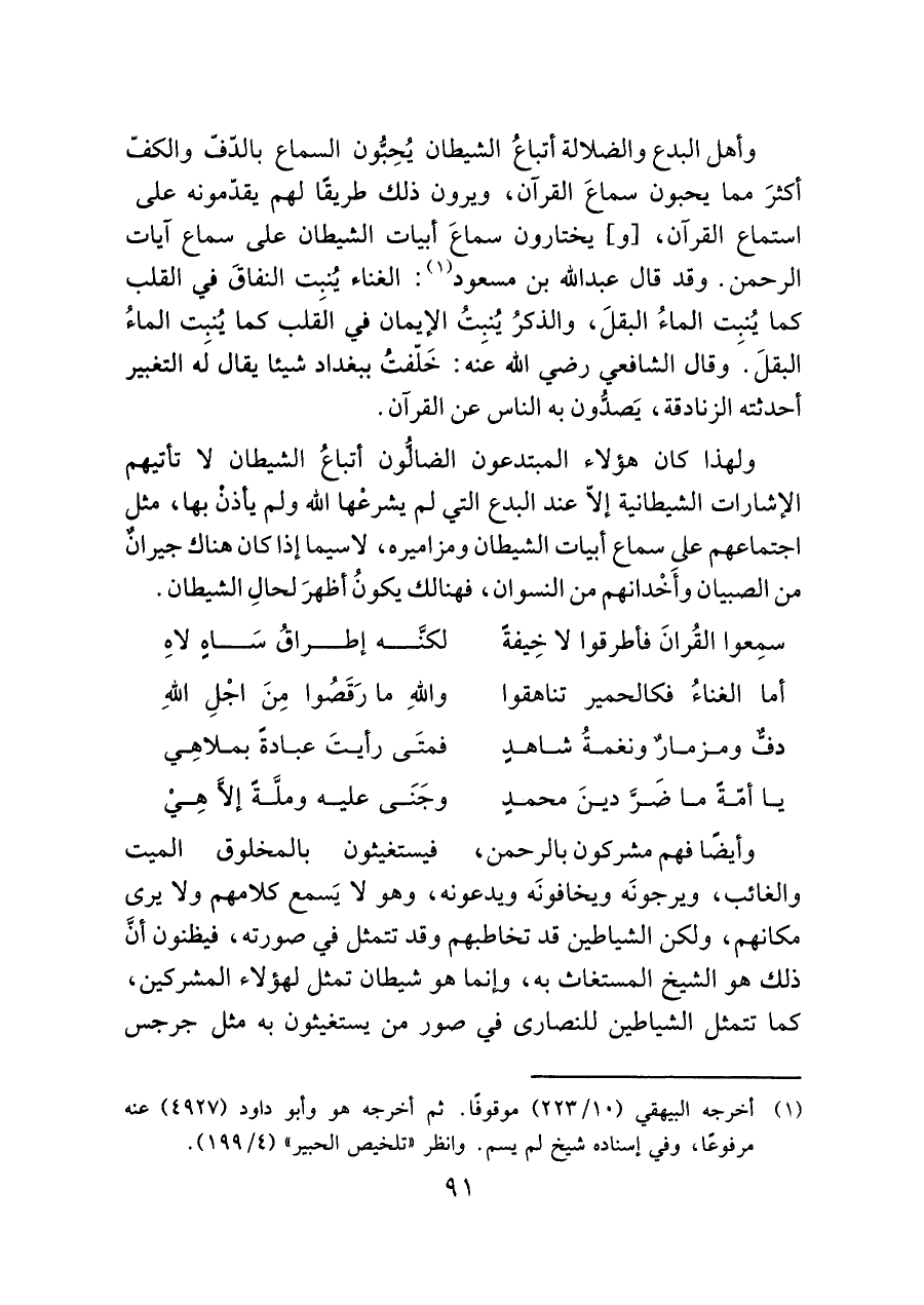 وأهل البدع والضلالة أتباعُ الشيطان يُحِبُّون السماع بالدّف والكفّ أكثرَ مما يحبون سماعَ القرآن، ويرون ذلك طريقًا لهم يقدّمونه على استماع القرآن، [و] يختارون سماعَ أبيات الشيطان على سماع آيات الرحمن. وقد قال عبد الله بن مسعود (¬١): الغناء يُنبت النفاقَ في القلب كما يُنبِت الماءُ البقلَ، والذكرُ ينبِتُ الإيمان في القلبَ كما ينبِت الماءُ البقلَ.