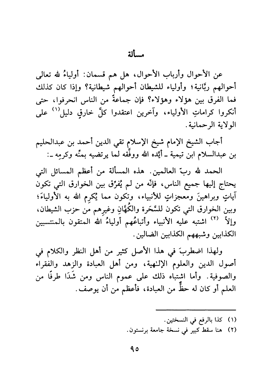 عن الأحوال وأرباب الأحوال، هل هم قسمان: أولياءُ لله تعالى أحوالهم ربانية؛ وأولياء للشيطان أحوالهم شيطانية؟ وإذا كان كذلك فما الفرق بين هؤلاء وهؤلاء؟ فإن جماعةً من الناس انحرفوا، حتى أنكروا كراماتِ الأولياء، وآخرين اعتقدوا كلَّ خارقٍ دليل (¬١) على الولاية الرحمانية.