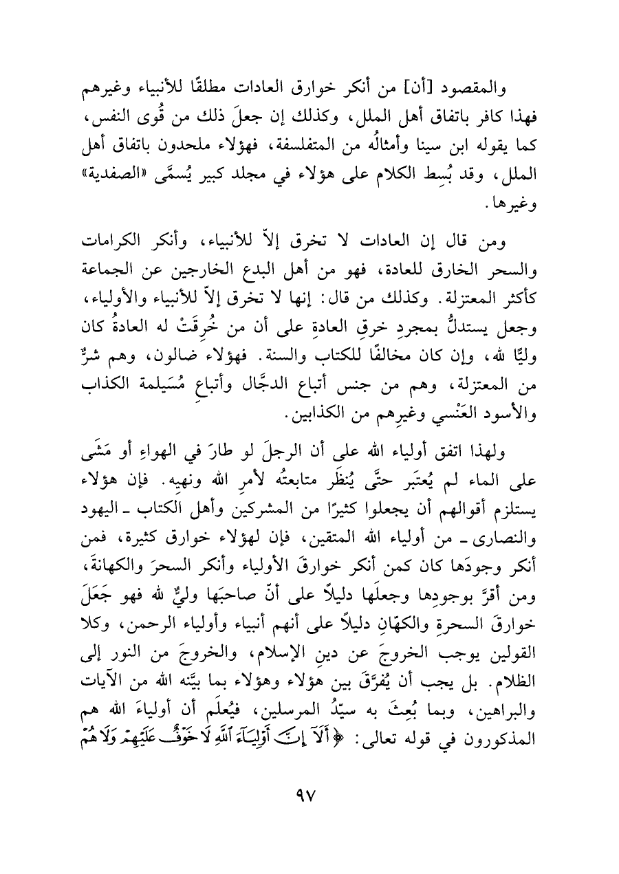 ولهذا اتفق أولياء الله على أن الرجلَ لو طارَ في الهواءِ أو مَشَى على الماء لم يُعتَبر حتَّى يُنظَر متابعتُه لأمرِ الله ونهيِه. فإن هؤلاء يستلزم أقوالهم أن يجعلوا كثيرًا من المشركين وأهل الكتاب - اليهود والنصارى - من أولياء الله المتقين، فإن لهؤلاء خوارق كثيرة، فمن أنكر وجودَها كان كمن أنكر خوارقَ الأولياء وأنكر السحرَ والكهانةَ، ومن أقرَّ بوجودِها وجعلَها دليلاً على أنّ صاحبَها وليّ لله فهو جَعَلَ خوارقَ السحرةِ والكهّانِ دليلاً على أنهم أنبياء وأولياء الرحمن، وكلا القولين يوجب الخروجَ عن دينِ الإسلام، والخروجَ من النور إلى الظلام. بل يجب أن يُفرَّقَ بين هؤلاء وهؤلاء بما بينه الله من الآيات والبراهين، وبما بُعِثَ به سيّدُ المرسلين، فيُعلَم أن أولياءَ الله هم المذكورون في قوله تعالى: (ألا إن أولياء الله لا خوف عليهم ولا هم