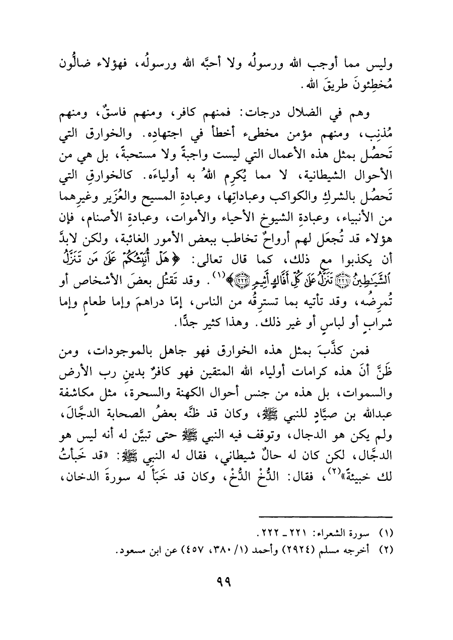 فمن كذَّبَ بمثل هذه الخوارق فهو جاهل بالموجودات، ومن ظَنَّ أنَ هذه كرامات أولياء الله المتقين فهو كافر بدينِ رب الأرض والسماوات، بل هذه من جنس أحوال الكهنة والسحرة، مثل مكاشفة عبد الله بن صيادٍ للنبي - صَلَّى اللَّهُ عَلَيْهِ وَسَلَّمَ -، وكان قد ظنَّه بعضُ الصحابة الدجالَ، ولم يكن هو الدجال، وتوقف فيه النبي - صَلَّى اللَّهُ عَلَيْهِ وَسَلَّمَ - حتى تبين له أنه ليس هو الدجال، لكن كان له حال شيطاني، فقال له النبي - صَلَّى اللَّهُ عَلَيْهِ وَسَلَّمَ -: "قد خَبأتُ لك خبيئةً" (¬٢)، فقال: الدُّخْ الدُّخْ، وكان قد خَبَأَ له سورةَ الدخان،