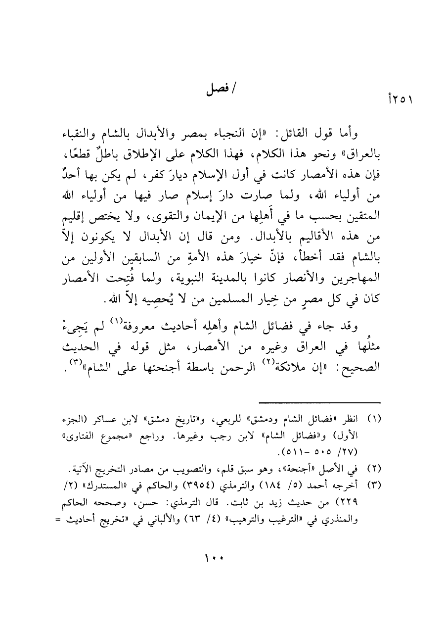 وقد جاء في فضائل الشام وأهلِه أحاديث معروفة (¬١) لم يَجئْ مثلُها في العراق وغيره من الأمصار، مثل قوله في الحدَيث الصحيح: "إن ملائكة (¬٢) الرحمن باسطة أجنحتها على الشام" (¬٣).
