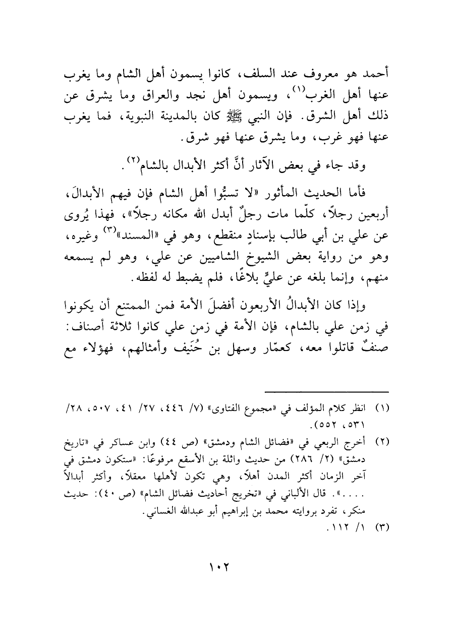 فأما الحديث المأثور "لا تسبُّوا أهل الشام فإن فيهم الأبدالَ، أربعين رجلاً، كلّما مات رجلٌ أبدل الله مكانه رجلا"، فهذا يُروى عن علي بن أبي طالب بإسنادٍ منقطع، وهو في "المسند" (¬٣) وغيره، وهو من رواية بعض الشيوخ الشاميين عن علي، وهو لم يسمعه منهم، وإنما بلغه عن علي بلاغًا، فلم يضبط له لفظه.