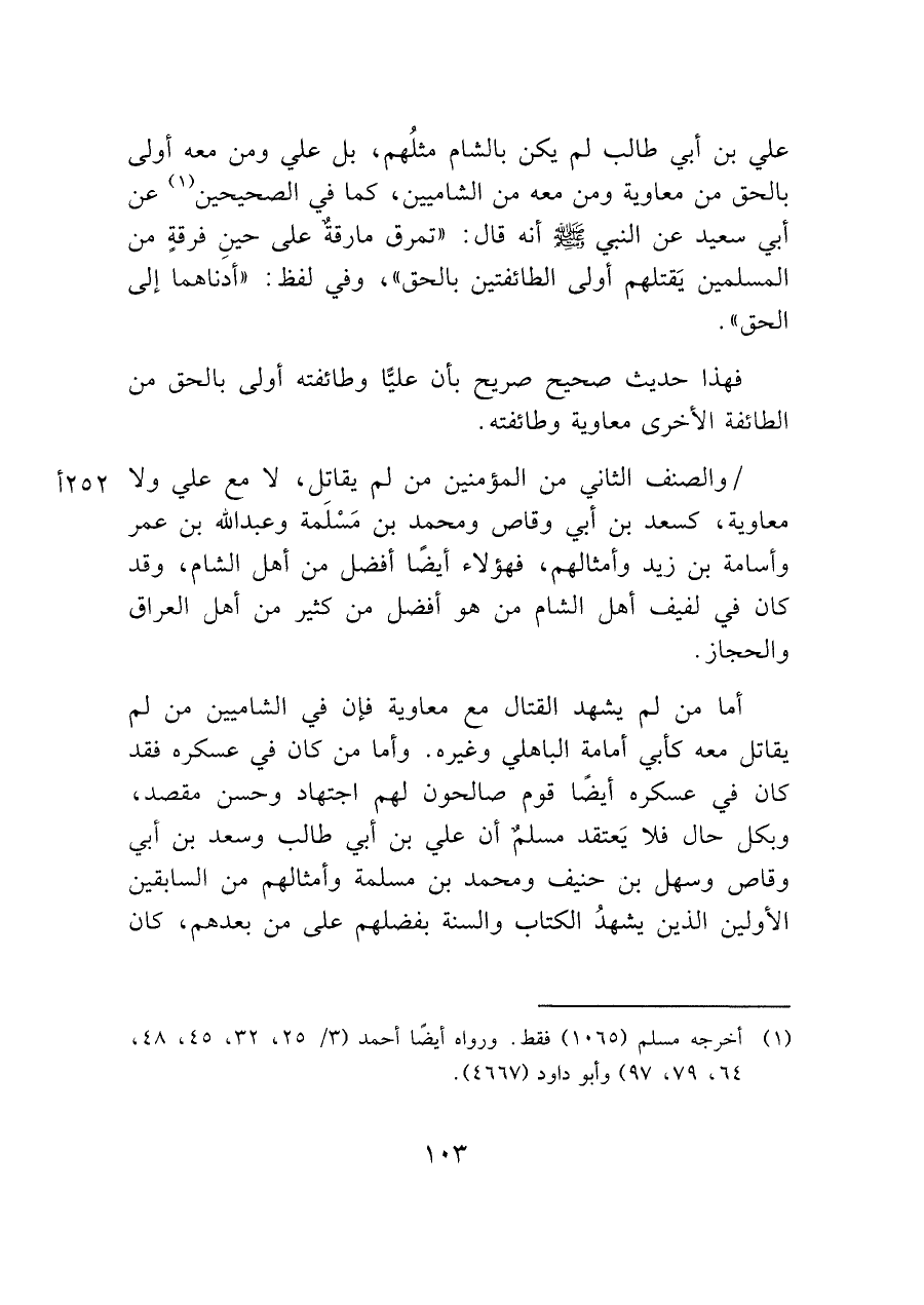 أما من لم يشهد القتال مع معاوية فإن في الشاميين من لم يقاتل معه كأبي أمامة الباهلي وغيره. وأما من كان في عسكره فقد كان في عسكره أيضًا قوم صالحون لهم اجتهاد وحسن مقصد، وبكل حال فلا يَعتقد مسلم أن علي بن أبي طالب وسعد بن أبي وقاص وسهل بن حنيف ومحمد بن مسلمة وأمثالهم من السابقين الأولين الذين يشهدُ الكتاب والسنة بفضلهم على من بعدهم، كان