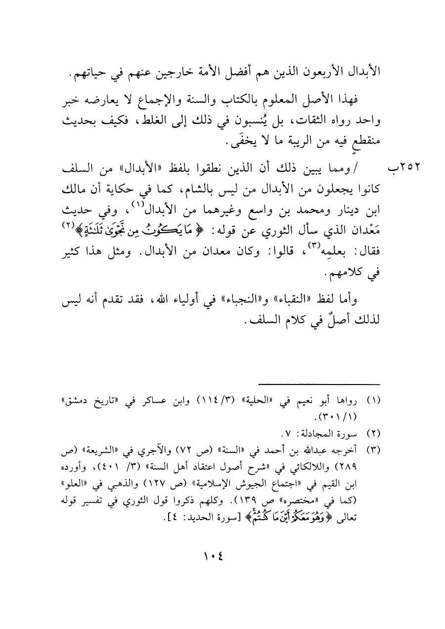 /ومما يبين ذلك أن الذين نطقوا بلفظ "الأبدال" من السلف كانوا يجعلون من الأبدال من ليس بالشام، كما في حكاية أن مالك ابن دينار ومحمد بن واسع وغيرهما من الأبدال (¬١)، وفي حديث مَعْدان الذي سأل الثوري عن قوله: (مَا يَكُونُ مِنْ نَجْوَى ثَلاثَةٍ) (¬٢) فقال: بعلمِه (¬٣)، قالوا: وكان معدان من الأبدال. ومثل هذا كثير في كلامهم.