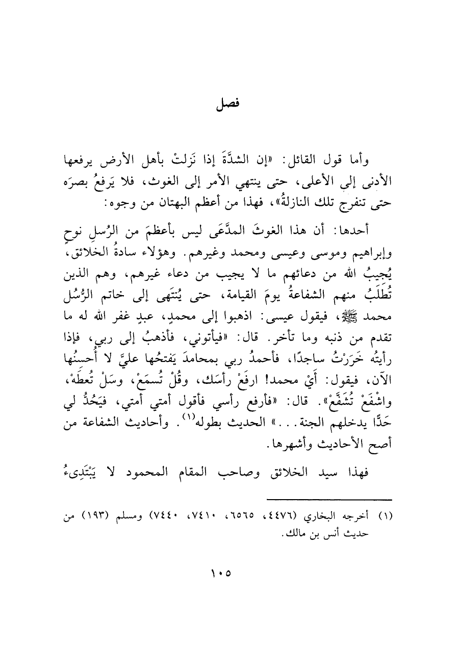 أحدها: أن هذا الغوثَ المدَّعَى ليس بأعظم من الرُسلِ نوح وإبراهيم وموسى وعيسى ومحمد وغيرهم. وهؤلاء سادةُ الخلائق، يُجيبُ الله من دعائهم ما لا يجيب من دعاء غيرهم، وهم الذين تُطَلَبُ منهم الشفاعةُ يومَ القيامة، حتى يُنتَهى إلى خاتم الرُسُل محمد - صَلَّى اللَّهُ عَلَيْهِ وَسَلَّمَ -، فيقول عيسى: اذهبوا إلى محمدٍ، عبدٍ غفر الله له ما تقدم من ذنبه وما تأخر. قال: "فيأتوني، فأذهبُ إلى ربي، فإذا رأيتُه خَرَرْتُ ساجدَا، فأحمدُ ربي بمحامدَ يَفتحُها عليَّ لا أُحسِنُها الآن، فيقول: أَيْ محمد, ارفَعْ رأسَك، وقُلْ تُسمَعْ، وسَلْ تُعطَهْ، واشْفَعْ تُشَفَّعْ". قال: "فأرفع رأسي فأقول أمتي أمتي، فيَحُذُ لي حَدًّا يدخلهم الجنة ... " الحديث بطوله (¬١). وأحاديث الشفاعة من أصح الأحاديث وأشهرها.