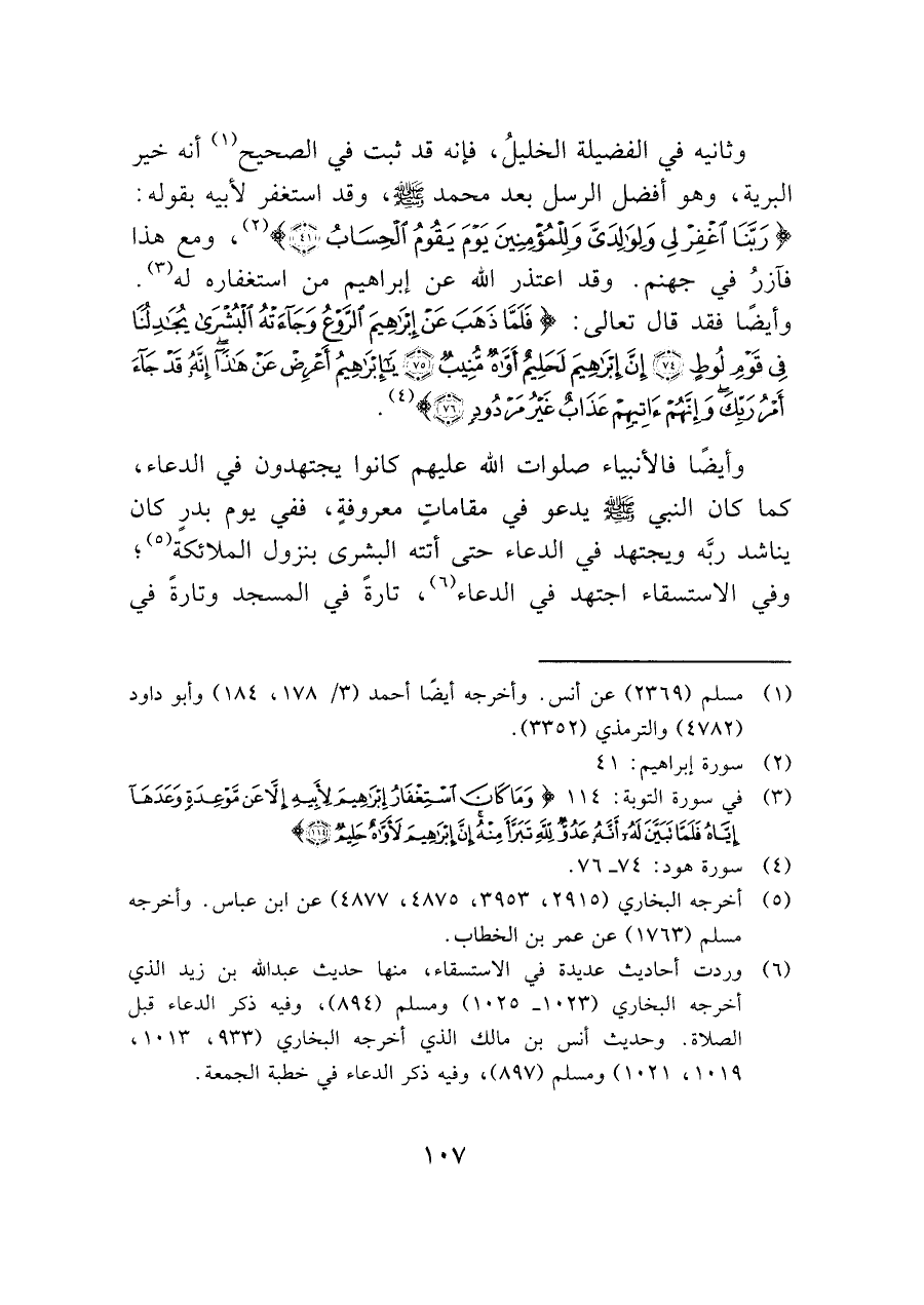 وأيضًا فالأنبياء صلوات الله عليهم كانوا يجتهدون في الدعاء، كما كان النبي - صَلَّى اللَّهُ عَلَيْهِ وَسَلَّمَ - ِ يدعو في مقاماتٍ معروفةٍ، ففي يوم بدرٍ كان يناشد ربَّه ويجتهد في الدعاء حتى أتته البشرى بنزول الملائكة (٥)؛ وفي الاستسقاء اجتهد في الدعاء (٦)، تارةً في المسجد وتارةً في