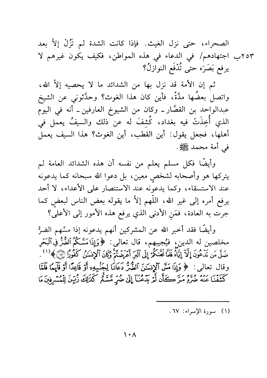 وأيضًا فكل مسلم يعلم من نفسه أن هذه الشدائد العامة لم يتركها هو وأصحابه لشخصٍ معين، بل دعوا الله سبحانه كما يدعونه عند الاستسقاء، وكما يدعونه عند الاستنصار على الأعداء، لا أحد يرفع أمره إلى غير الله، الفهم إلاّ ما يقوله بعض الناس لبعضٍ كما جرت به العادة، فمَنِ الأدنى الذي يرفع هذه الأمور إلى الأعلى؟