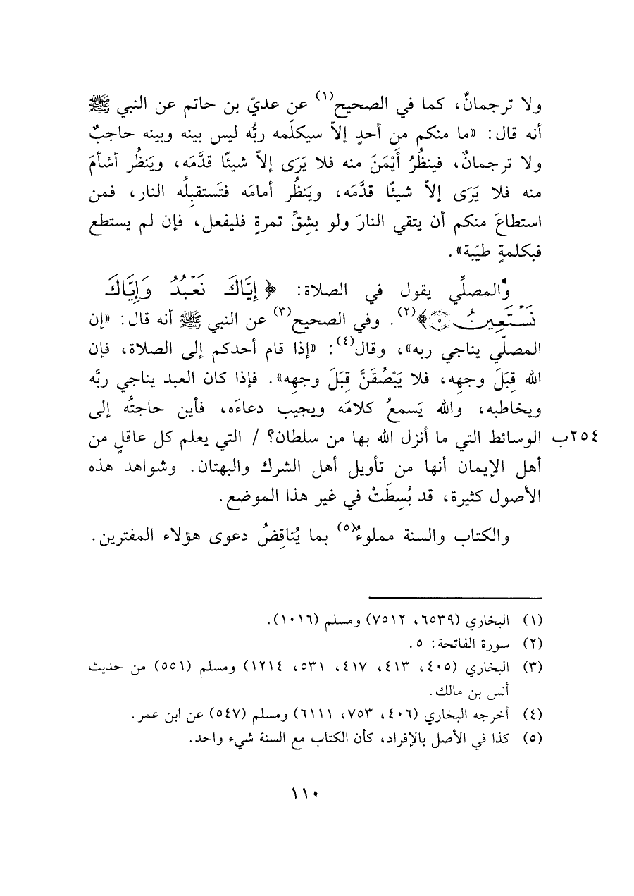 والمصلِّي يقول في الصلاة: (إِيَّاكَ نَعْبُدُ وَإِيَّاكَ نَسْتَعِينُ (٥)) (¬٢). وفي الصحيح (¬٣) عن النبي - صَلَّى اللَّهُ عَلَيْهِ وَسَلَّمَ - أنه قال: "إن المصلّي يناجي ربه"، وقال (¬٤): "إذا قام أحدكم إلى الصلاة، فإن الله قِبَلَ وجهِه، فلا يَبْصُقَنَّ قِبَلَ وجهِه". فإذا كان العبد يناجي ربَّه ويخاطبه، والله يَسمعُ كلامَه ويجيب دعاءَه، فأين حاجتُه إلى الوسائط التي ما أنزل الله بها من سلطان؟ /التي يعلم كل عاقلٍ من أهل الإيمان أنها من تأويل أهل الشرك والبهتان. وشواهد هذه الأصول كثيرة، قد بُسِطَتْ في غير هذا الموضع.
