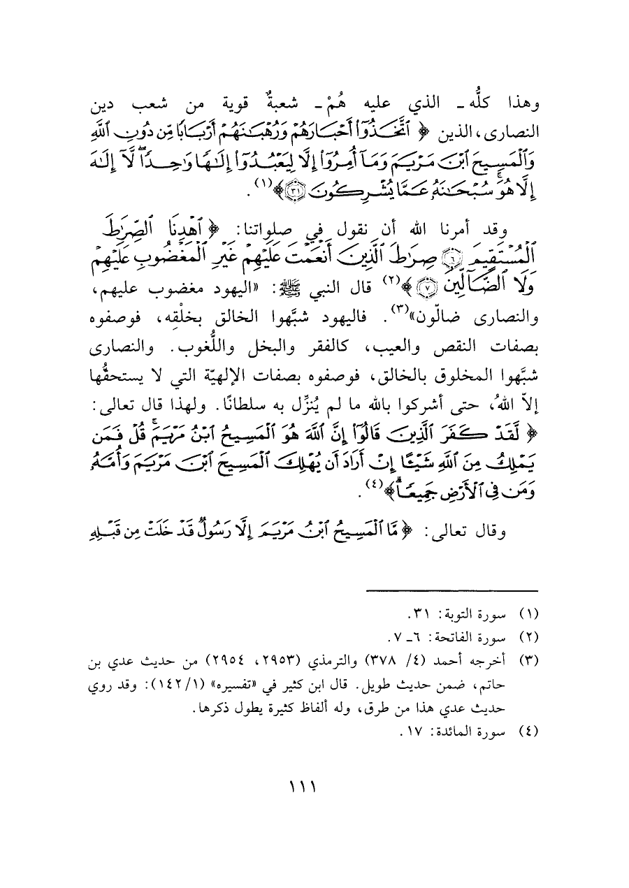 وقد أمرنا الله أن نقول في صلوِاتنا: (اهْدِنَا الصِّرَاطَ الْمُسْتَقِيمَ (٦) صِرَاطَ الَّذِينَ أَنْعَمْتَ عَلَيْهِمْ غَيْرِ الْمَغْضُوبِ عَلَيْهِمْ وَلَا الضَّالِّين (٧)) (¬٢) قال النبي - صَلَّى اللَّهُ عَلَيْهِ وَسَلَّمَ -: (اليهود مغضوب عليهم، والنصارى ضالّون" (¬٣). فاليهود شبَّهوا الخالق بخلْقِه، فوصفوه بصفات النقص والعيب، كالفقر والبخل واللُّغوب. والنصارى شبَّهوا المخلوق بالخالق، فوصفوه بصفات الإلهيّة التي لا يستحقها إلاّ الله، حتى أشركوا بالله ما لم يُنزِّل به سلطانًا. ولهذا قال تعالى: (لَقَدْ كَفَرَ الَّذِينَ قَالُوا إِنَّ اللَّهَ هُوَ الْمَسِيحُ ابْنُ مَرْيَمَ قُلْ فَمَنْ يَمْلِكُ مِنَ اللَّهِ شَيْئًا إِنْ أَرَادَ أَنْ يُهْلِكَ الْمَسِيحَ ابْنَ مَرْيَمَ وَأُمَّهُ وَمَنْ فِي الْأَرْضِ جَمِيعًا (١٧)) (¬٤).
