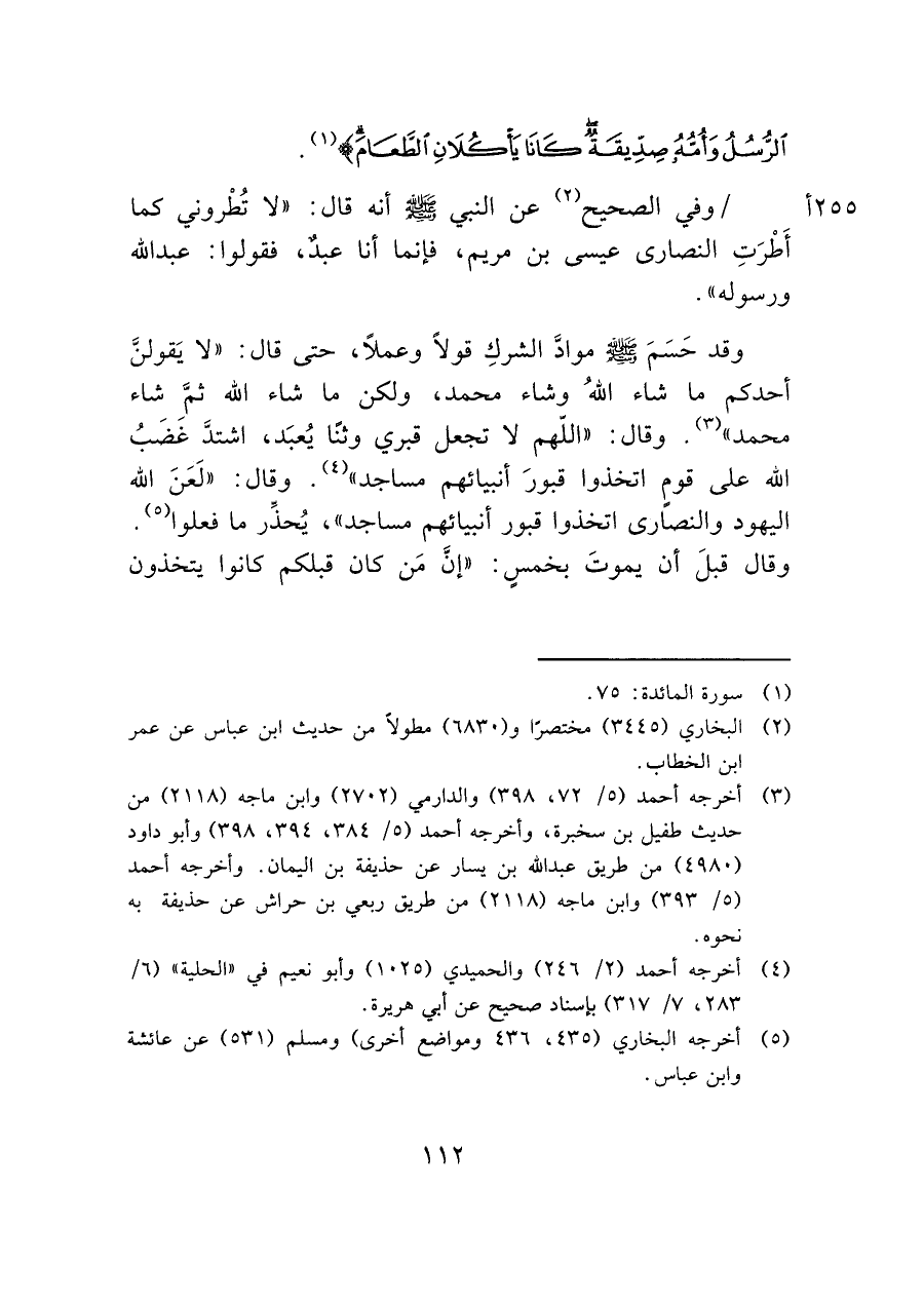 /وفي الصحيح (¬٢) عن النبي - صَلَّى اللَّهُ عَلَيْهِ وَسَلَّمَ - أنه قال: "لا تُطْروني كما أَطْرَتِ النصارى عيسى بن مريم، فإنما أنا عبد، فقولوا: عبد الله ورسوله". وقد حَسَمَ - صَلَّى اللَّهُ عَلَيْهِ وَسَلَّمَ - موادَّ الشركِ قولاً وعملاً، حتى قال: "لا يَقولنَّ أحدكم ما شاء الله وشاء محمد، ولكن ما شاء الله ثمَِّ شاء محمد" (¬٣). وقال: "اللهم لا تجعل قبري وثنًا يُعبَد، اشتدَّ غضَبُ الله على قوم اتخذوا قبورَ أنبيائهم مساجد" (¬٤). وقال: "لَعَنَ الله اليهود والنصارى اتخذوا قبور أنبيائهم مساجد"، يُحذر ما فعلوا (¬٥).