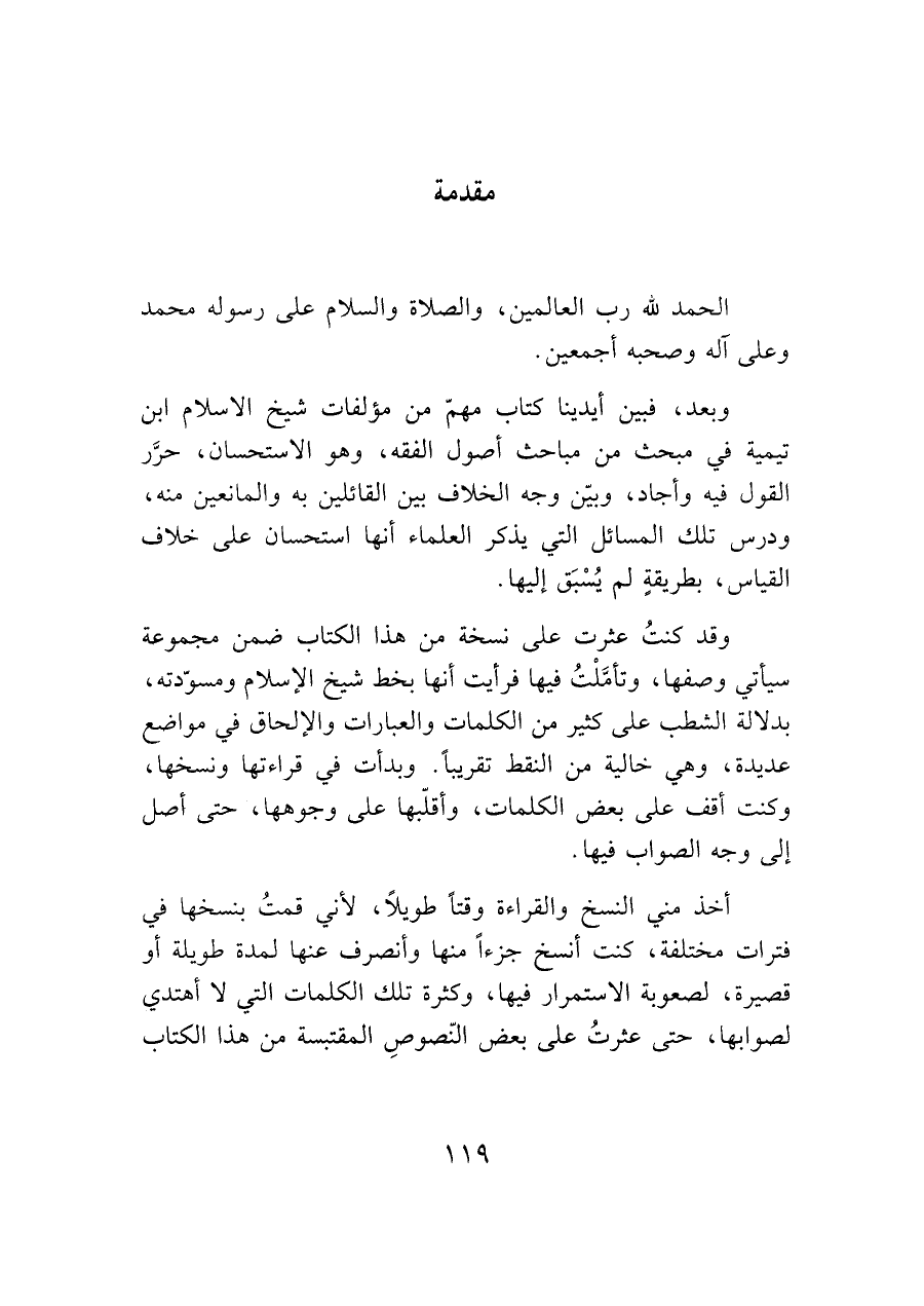 وبعد، فبين أيدينا كتاب مهتم من مؤلفات شيخ الإسلام ابن تيمية في مبحث من مباحث أصول الفقه، وهو الاستحسان، حرَّر القول فيه وأجاد، وبيّن وجه الخلاف بين القائلين به والمانعين منه، ودرس تلك المسائل التي يذكر العلماء أنها استحسان على خلاف القياس، بطريقةِ لم يُسبَق إليها.