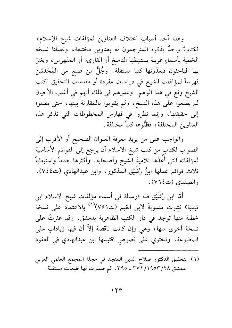 وهذا أحد أسباب اختلاف العناوين لمؤلفات شيخ الإسلام، فكتابٌ واحد يذكره المترجمون له بعناوين مختلفة، وتصلنا نسخه الخطية بأسماء غريبة يستنبطها الناسخ أو القارئ أو المفهرس، ويغترّ بها الباحثون فيعدّونها كتبا مستقلة. وجُل من صنع من المُحْدَثين فهرساً لمؤلفات الشيخ في دراسات مفردة أو مقدمات التحقيق لكتب الشيخ وقع في هذا الوهم. وعذرهم في ذلك أنهم في أغلب، الأحيان لم يطلعوا على هذه النسخ، ولم يقوموا بالمقارنة بينها، حتى يصلوا إلى حقيقتها، وإنما نظروا في فهارس المخطوطات التي تذكر هذه العناوين المختلفة، فظنوها كتباً مختلفة.