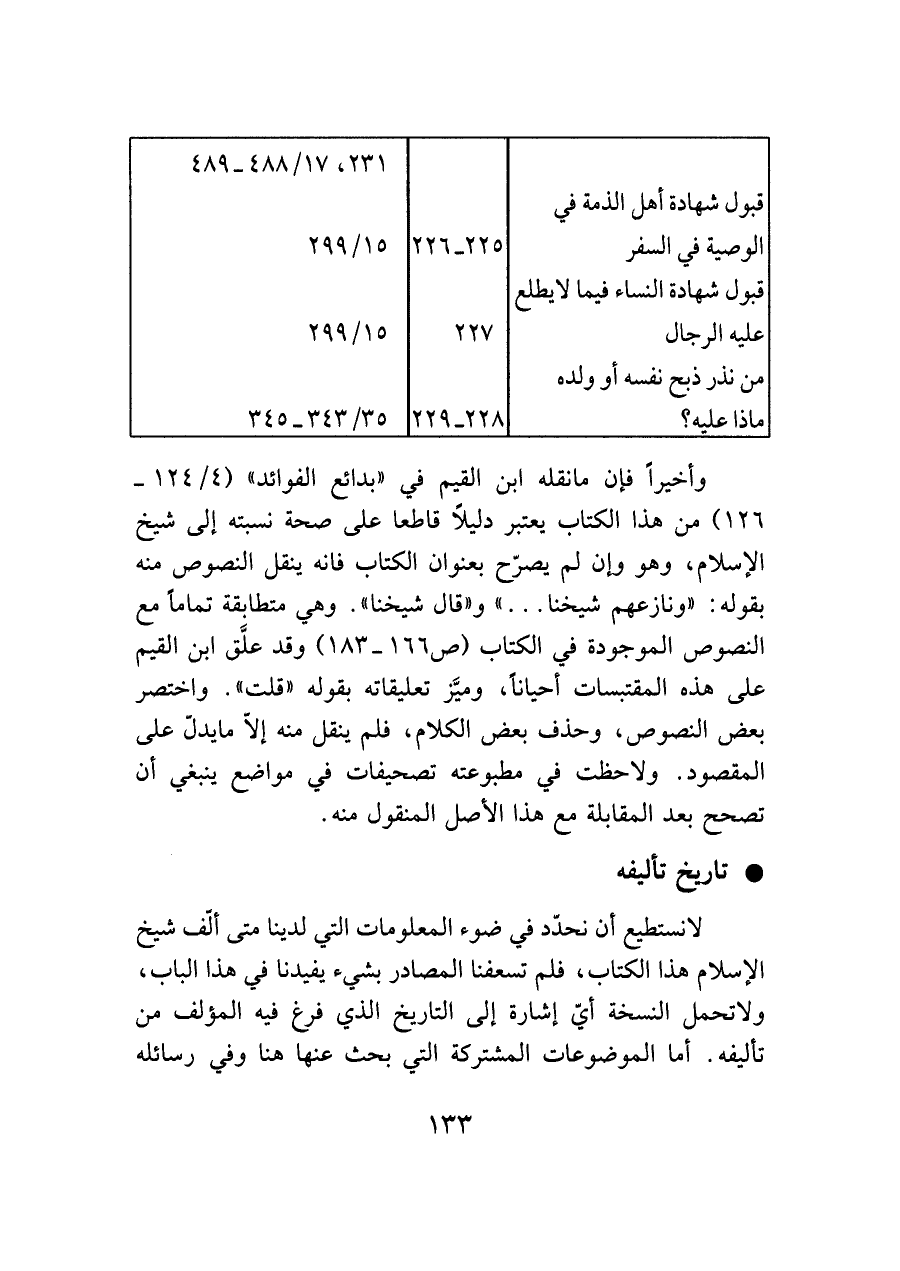 وأخيراً فإن ما نقله ابن القيم في "بدائع الفوائد" (٤/ ١٢٤ - ١٢٦) من هذا الكتاب يعتبر دليلاً قاطعا على صحة نسبته إلى شيخ الإسلام، وهو وإن لم يصرّح بعنوان الكتاب فانه ينقل النصوص منه بقوله: "ونازعهم شيخنا ... " و"قال شيخنا". وهي متطابقة تماماً مع النصوص الموجودة في الكتاب (ص ١٦٦ - ١٨٣) وقد علَّق ابن القيم على هذه المقتبسات أحيانا، وميَّز تعليقاته بقوله "قلت". واختصر بعض النصوص، وحذف بعض الكلام، فلم ينقل منه إلاّ ما يدلّ على المقصود. ولاحظت في مطبوعته تصحيفات في مواضع ينبغي أن تصحح بعد المقابلة مع هذا الأصل المنقول منه.