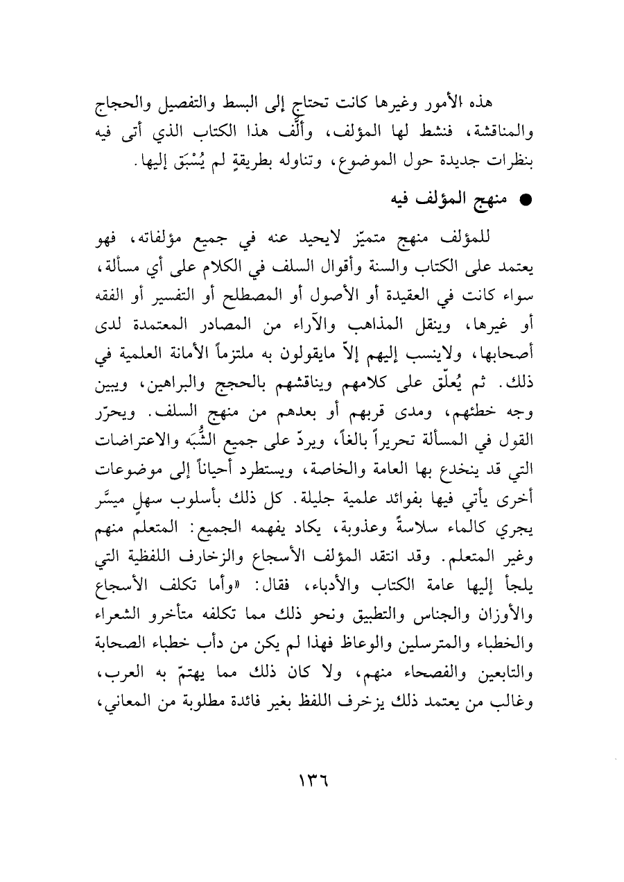 للمؤلف منهج متميّز لا يحيد عنه في جميع مؤلفاته، فهو يعتمد على الكتاب والسنة وأقوال السلف في الكلام على أي مسألة، سواء كانت في العقيدة أو الأصول أو المصطلح أو التفسير أو الفقه أو غيرها، وينقل المذاهب والآراء من المصادر المعتمدة لدى أصحابها، ولا ينسب إليهم إلاّ ما يقولون به ملتزماً الأمانة العلمية في ذلك. ثم يُعلّق على كلامهم ويناقشهم بالحجج والبراهين، ويبين وجه خطئهم، ومدى قربهم أو بعدهم من منهج السلف. ويحرّر القول في المسألة تحريراً بالغاً، ويردّ على جميع الشُبَه والاعتراضات التي قد ينخدع بها العامة والخاصة، ويستطرد أحياناً إلى موضوعات أخرى يأتي فيها بفوائد علمية جليلة. كل ذلك بأسلوب سهلٍ ميسَّر يجري كالماء سلاسةً وعذوبة، يكاد يفهمه الجميع: المتعلم منهم وغير المتعلم. وقد انتقد المؤلف الأسجاع والزخارف اللفظية التي يلجأ إليها عامة الكتاب والأدباء، فقال: "وأما تكلف الأسجاع والأوزان والجناس والتطبيق ونحو ذلك مما تكلفه متأخرو الشعراء والخطباء والمترسلين والوعاظ فهذا لم يكن من دأب خطباء الصحابة والتابعين والفصحاء منهم، ولا كان ذلك مما يهتمّ به العرب، وغالب من يعتمد ذلك يزخرف اللفظ بغير فائدة مطلوبة من المعاني،