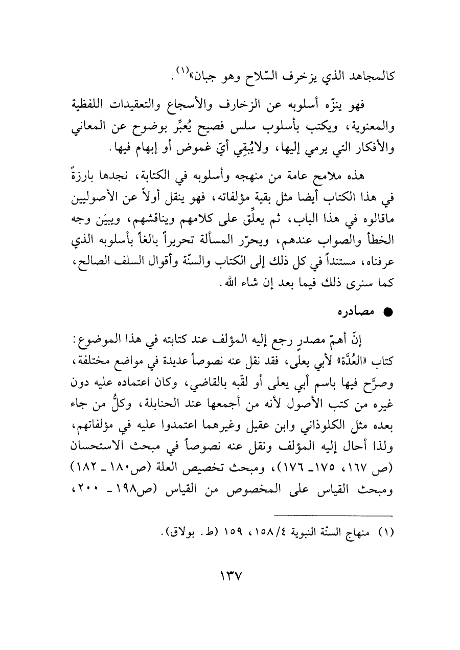 إن أهمّ مصدرٍ رجع إليه المؤلف عند كتابته في هذا الموضوع: كتاب "العدَّة" لأبي يعلى، فقد نقل عنه نصوصا عديدة في مواضع مختلفة، وصرَّح فيها باسم أبي يعلى أو لقّبه بالقاضي، وكان اعتماده عليه دون غيره من كتب الأصول لأنه من أجمعها عند الحنابلة، وكلُّ من جاء بعده مثل الكلوذاني وابن عقيل وغيرهما اعتمدوا عليه في مؤلفاتهم، ولذا أحال إليه المؤلف ونقل عنه نصوصا في مبحث الاستحسان (ص ١٦٧، ١٧٥ - ١٧٦)، ومبحث تخصيص العلة (ص ١٨٠ - ١٨٢) ومبحث القياس على المخصوص من القياس (ص ١٩٨ - ٢٠٠،