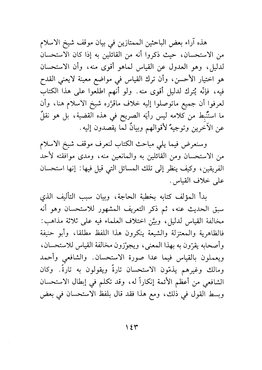 هذه آراء بعض الباحثين الممتازين في بيان موقف شيخ الإسلام من الاستحسان، حيث ذكروا أنه من القائلين به إذا كان الاستحسان لدليل، وهو العدول عن القياس لما هو أقوى منه، وأن الاستحسان هو اختيار الأحسن، وأن ترك القياس في مواضع معينة لا يعني القدح فيه، فإنّه يحرك لدليل أقوى منه. ولو أنهم اطلعوا على هذا الكتاب لعرفوا أن جميع ما توصلوا إليه خلاف ما قرَّره شيخ الإسلام هنا، وأن ما استنبِط من كلامه ليس رأيَه الصريح في هذه القضية، بل هو نقل عن الآخرين وتوجيهٌ لأقوالهم وبيان لما يقصدون إليه.