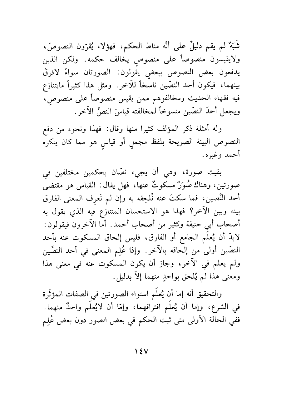 شَبَهٌ لم يقم دليلٌ على أنه مناط الحكم، فهؤلاء يُقرّون النصوصَ، ولا يقيسون منصوصاً على منصوص يخالف حكمه. ولكن الذين يدفعون بعض النصوص ببعض يقولون: الصورتان سواءٌ لا فرقَ بينهما، فيكون أحد النصين ناسخاً للآخر. ومثل هذا كثيرا ما يتنازع فيه فقهاء الحديث ومخالفوهم ممن يقيس منصوصاً على منصوصٍ، ويجعل أحدَ النصين منسوخاً لمخالفته قياسَ النص الآخر.