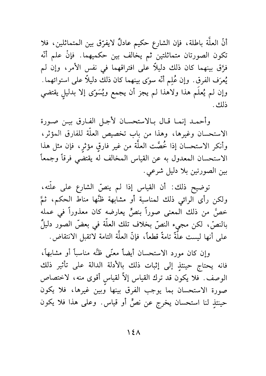 وأحمد إنما قال بالاستحسان لأجل الفارق بين صورة الاستحسان وغيرها، وهذا من باب تخصيص العلّة للفارق المؤثر، وأنكر الاستحسان إذا خُصَّت العلَّة من غير فارقٍ مؤثرٍ، فإن مثل هذا الاستحسان المعدول به عن القياس المخالف له يقتضي فرقاً وجمعاً بين الصورتين بلا دليل شرعي.