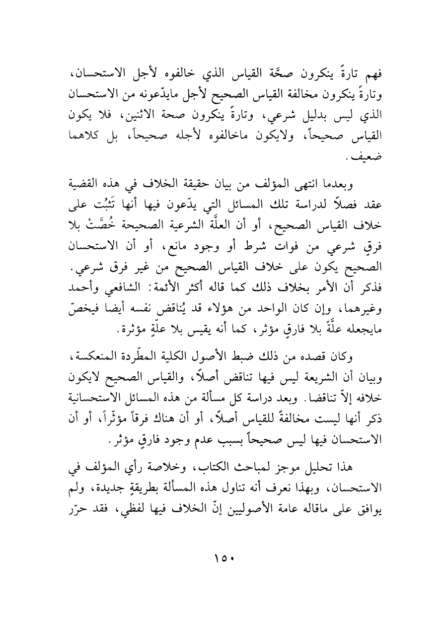 هذا تحليل موجز لمباحث الكتاب، وخلاصة رأي المؤلف في الاستحسان، وبهذا نعرف أنه تناول هذه المسألة بطريقةٍ جديدة، ولم يوافق على ما قاله عامة الأصوليين إنّ الخلاف فيها لفظي، فقد حرّر