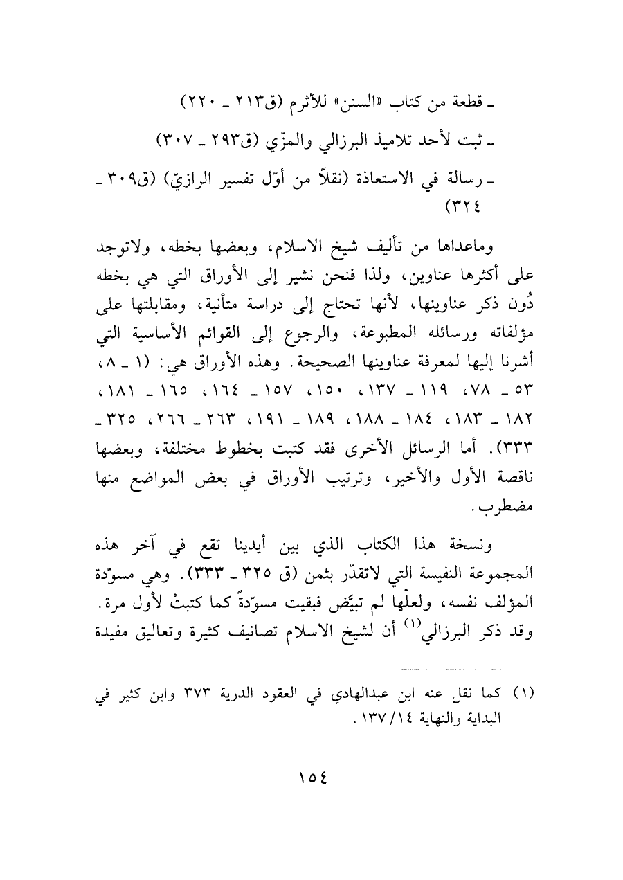 - رسالة في الاستعاذة (نقلَا من أوّل تفسير الرازي) (ق ٣٠٩ - ٣٢٤) وماعداها من تأليف شيخ الإسلام، وبعضها بخطه، ولا توجد على أكثرها عناوين، ولذا فنحن نشير إلى الأوراق التي هي بخطه دُون ذكر عناوينها، لأنها تحتاج إلى دراسة متأنية، ومقابلتها على مؤلفاته ورسائله المطبوعة، والرجوع إلى القوائم الأساسية التي أشرنا إليها لمعرفة عناوينها الصحيحة. وهذه الأوراق هي: (١ - ٨، ٥٣ - ٧٨، ١١٩ - ١٣٧, ١٥٠، ١٥٧ - ١٦٤. ١٦٥ - ١٨١، ١٨٢ - ١٨٣، ١٨٤ - ١٨٨، ١٨٩ - ١٩١، ٢٦٣ - ٢٦٦، ٣٢٥ - ٣٣٣). أما الرسائل الأخرى فقد كتبت بخطوط مختلفة، وبعضها ناقصة الأول والأخير، وترتيب الأوراق في بعض المواضع منها مضطرب.