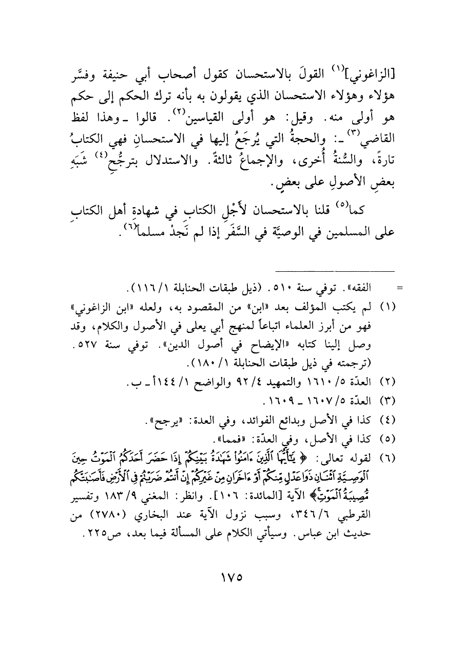 [الزاغوني] (¬١) القولَ بالاستحسان كقول أصحاب أبي حنيفة وفسر هؤلاء وهؤلاء الاستحسان الذي يقولون به بأنه ترك الحكم إلى حكم هو أولى منه. وقيل: هو أولى القياسين (¬٢). قالوا- وهذا لفظ القاضي (¬٣) -: والحجةُ التي يُرجَعُ إليها في الاستحسانِ فهي الكتابُ تارةً، والسُّنةُ أُخرى، والإجماعُ ثالثةً. والاستدلال بترجحِ (¬٤) شَبَهِ بعضِ الأصولِ على بعضِ.