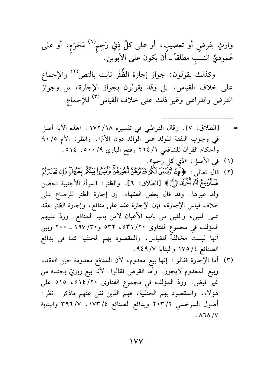 (¬٢) قال تعالى: (فَإِنْ أَرْضَعْنَ لَكُمْ فَآتُوهُنَّ أُجُورَهُنَّ وَأْتَمِرُوا بَيْنَكُمْ بِمَعْرُوفٍ وَإِنْ تَعَاسَرْتُمْ فَسَتُرْضِعُ لَهُ أُخْرَى (٦)) [الطلاق: من الآية ٦]. والظئر: المرأة الأجنبية تحضن ولد غيرها. وقد قال بعض الفقهاء: إن إجارة الظئر للرضاع على خلاف قياس الإجارة، فإن الإجارة عقد على منافع، وإجارة الظئر عقد على اللبن، واللبن من باب الأعيان لا من باب المنافع. وردّ عليهم المؤلف في مجموع الفتاوى ٢٠/ ٥٣١، ٥٣٢ و ٣٠/ ١٩٧ - ٢٠٠ وبين أنها ليست مخالفة للقياس. والمقصود بهم الحنفية كما في بدائع الصنائع ٤/ ١٧٥ والبناية ٧/ ٩٤٩.