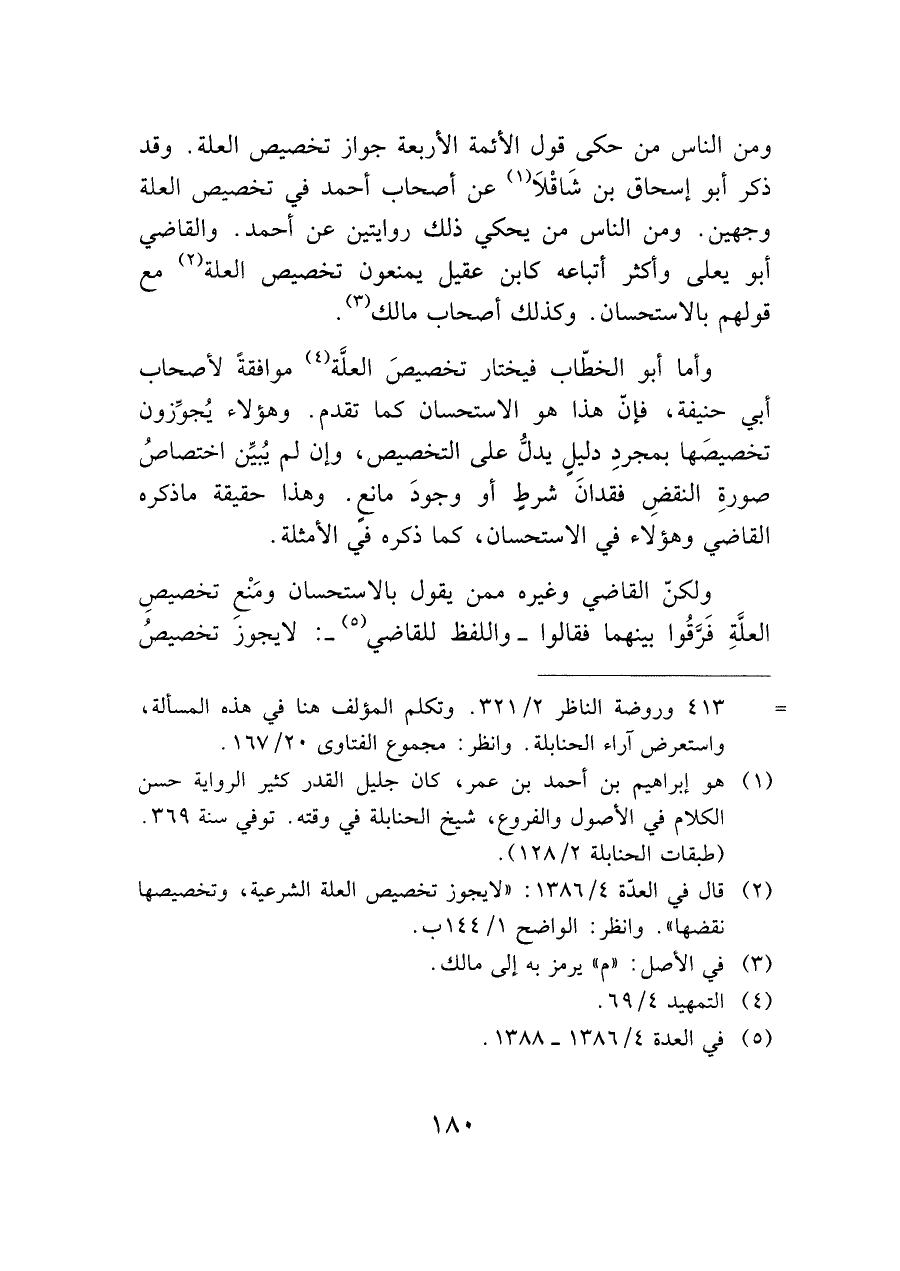 ومن الناس من حكى قول الأئمة الأربعة جواز تخصيص العلة. وقد ذكر أبو إسحاق بن شَاقْلَا (¬١) عن أصحاب أحمد في تخصيص العلة وجهين. ومن الناس من يحكي ذلك روايتين عن أحمد. والقاضي أبو يعلى وأكثر أتباعه كابن عقيل يمنعون تخصيص العلة (¬٢) مع قولهم بالاستحسان. وكذلك أصحاب مالك (¬٣).