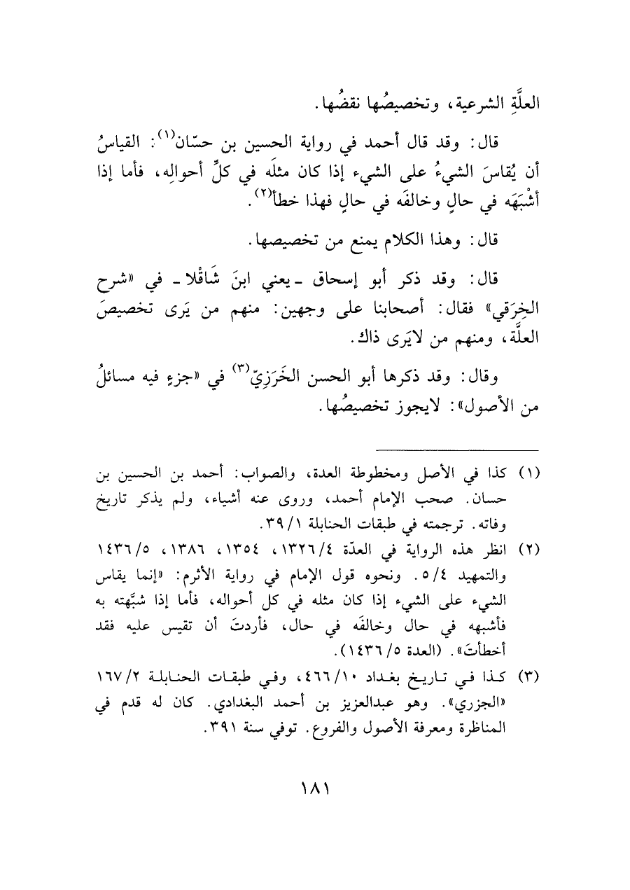 قال: وقد ذكر أبو إسحاق- يعني ابنَ شَاقْلا- في "شرح الخِرَقي" فقال: أصحابنا على وجهين: منهم من يَرى تخصيصَ العلَّة، ومنهم من لا يَرى ذاك.