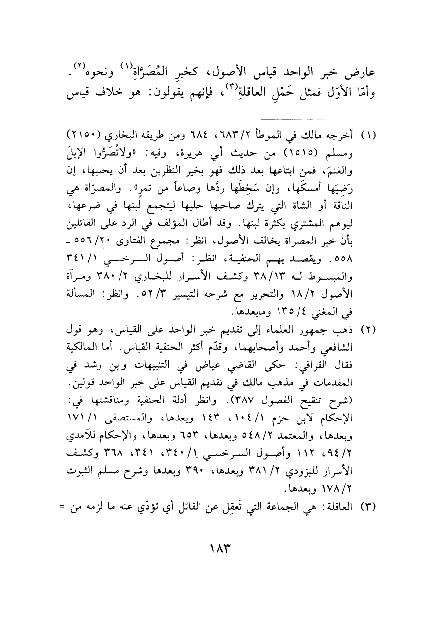 (¬٢) ذهب جمهور العلماء إلى تقديم خبر الواحد على القياس، وهو قول الشافعي وأحمد وأصحابهما، وقدم أكثر الحنفية القياس. أما المالكية فقال القرافي: حكى القاضي عياض في التنبيهات وابن رشد في المقدمات في مذهب مالك في تقديم القياس على خبر الواحد قولين. (شرح تنقيح الفصول ٣٨٧). وانظر أدلة الحنفية ومناقشتها في: الإحكام لابن حزم ١/ ١٠٤، ١٤٣ وبعدها، والمستصفى ١/ ١٧١ وبعدها، والمعتمد ٢/ ٥٤٨ وبعدها، ٦٥٣ وبعدها، والإحكام للآمدي ٢/ ٩٤، ١١٢ وأصول السرخسي ١/ ٣٤٠، ٣٤١، ٣٦٨ وكشف الأسرار للبزودي ٢/ ٣٨١ وبعدها، ٣٩٠ وبعدها وشرح مسلم الثبوت ٢/ ١٧٨ وبعدها.