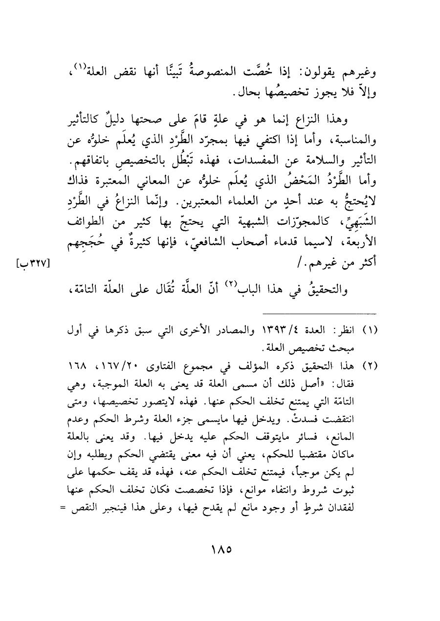 وهذا النزاع إنما هو في عل! قامَ على صحتها دليل كالتأثير والمناسبة، وأما إذا اكتفي فيها بمجرّد الطَرْدِ الذي يُعلَم خلوُّه عن التأثير والسلامة عن المفسدات، فهذه تَبْطُل بالتخصيصِ باتفاقهم. وأما الطَّرْدُ المَحْضُ الذي يُعلَم خلوُّه عن المعاني المعتبرة فذاك لا يُحتج به عند أحد من العلماء المعتبرين. وإنما النزاعُ في الطَرْدِ الشَبَهِيَّ، كالمجوزات - الشبهية التي يحتجّ بها كثير من الطوائف الأربعة، لاسيما قدماء أصحاب الشافعيّ، فإنها كثيرة في حُجَجِهم أكثر من غيرهم./