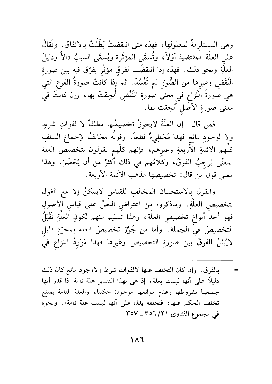 = بالفرق. وإن كان التخلف عنها لا لفوات شرط ولاوجود مانع كان ذلك دليلاً على أنها ليست بعلة، إذ هي بهذا التقدير علة تامة إذا قدر أنها جميعها بشروطها وعدم موانعها موجودة حكما، والعلة التامة يمتنع تخلف الحكم عنها، فتخلفه يدل على أنها ليست علة تامة". ونحوه في مجموع الفتاوى ٢١/ ٣٥٦ - ٣٥٧.