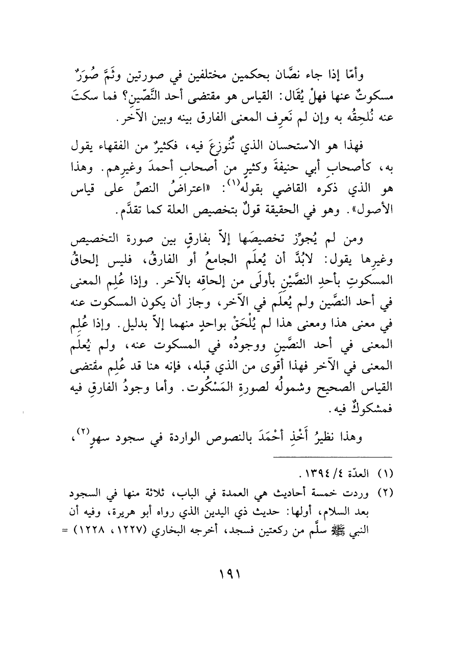 ومن لم يُجوِّز تخصيصَها إلاّ بفارقي بين صورة التخصيص وغيرِها يقول: لابُد أن يُعلَم الجامعُ أو الفارقُ، فليس إلحاقُ المسكوتِ بأحد النصيْنِ بأولى من إلحاقِه بالآخر. وإذا عُلِم المعنى في أحد النصين ولم يُعلَم في الآخر، وجاز أن يكون المسكوت عنه في معنى هذا ومعنى هذا لم يُلْحَقْ بواحدِ منهما إلاّ بدليل. وإذا عُلِم المعنى في أحد النصينِ ووجودُه في المسكوت عنه، ولم يعلَم المعنى في الآخر فهذا أقوى من الذي قبله، فإنه هنا قد عُلِم مقتضى القياس الصحيح وشمولُه لصورةِ المَسْكُوت. وأما وجودُ الفارقِ فيه فمشكوك فيه.
