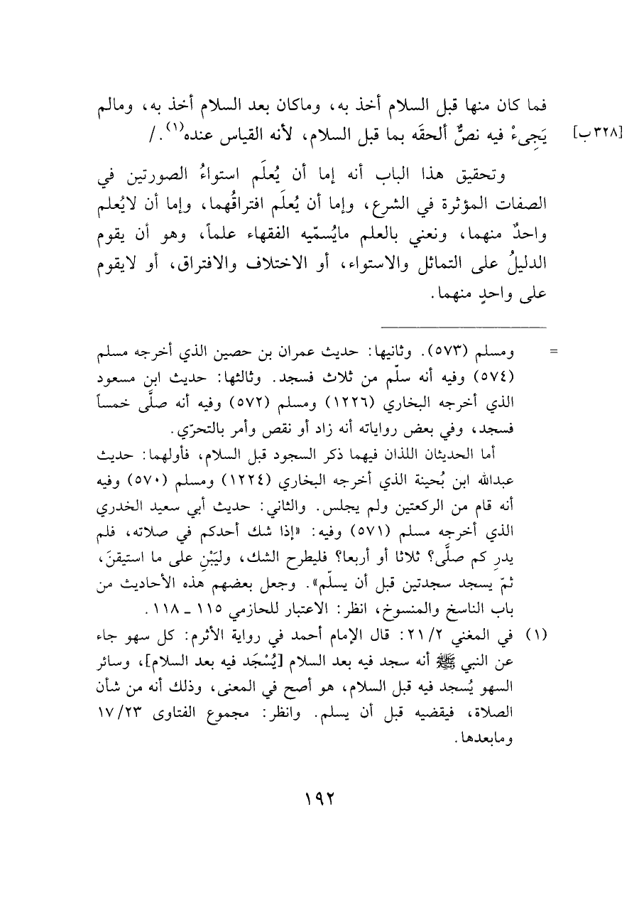 أما الحديثان اللذان فيهما ذكر السجود قبل السلام، فأولهما: حديث عبد الله ابن بُحينة الذي أخرجه البخاري (١٢٢٤) ومسلم (٥٧٠) وفيه أنه قام من الركعتين ولم يجلس. والثاني: حديث أبي سعيد الخدري الذي أخرجه مسلم (٥٧١) وفيه: "إذا شك أحدكم في صلاته، فلم يدرِ كم صلى؟ ثلاثا أو أربعا؟ فليطرح الشك، وليَبْنِ على ما استيقنَ، ثم يسجد سجدتين قبل أن يسلم ". وجعل بعضهم هذه الأحاديث من باب الناسخ والمنسوخ، انظر: الاعتبار للحازمي ١١٥ - ١١٨.