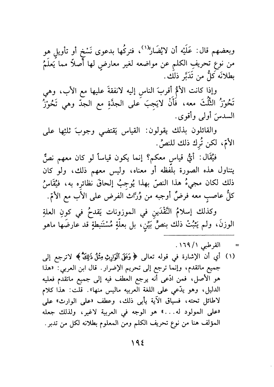 (¬١) أي أن الإشارة في قوله تعالى (وَعَلَى الوَارِث مِثلُ ذَلِك) لا ترجع إلى جميع ما تقدم، وإنما ترجع إلى تحريم الإضرار. قال ابن العربي: "هذا هو الأصل، فمن ادّعى أنه يرجع العطف فيه إلى جميع ما تقدم فعليه الدليل، وهو يدّعي على اللغة العربية ما ليس منها". قلت: هذا كلام لا طائل تحته، فسياق الآية يأبي ذلك، وعطف "على الوارث" على "على المولود له ... " هو الوجه في العربية لا غير، ولذلك جعله المؤلف هنا من نوع تحريف الكلم ومن المعلوم بطلانه لكل من تدبر.