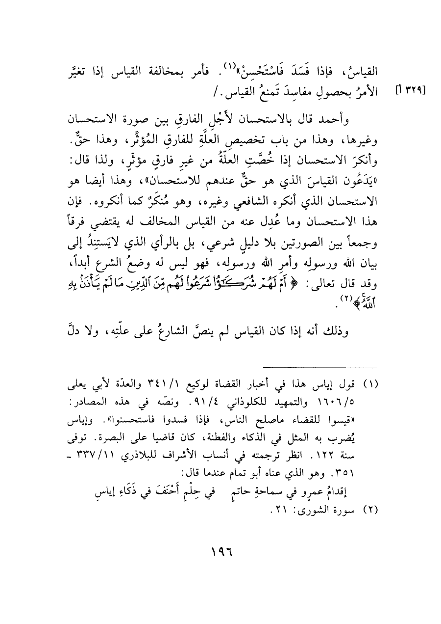 وأحمد قال بالاستحسان لأجْلِ الفارقِ بين صورة الاستحسان وغيرها، وهذا من باب تخصيصِ العلَّةِ للفارقِ المُؤثر، وهذا حق. وأنكرَ الاستحسان إذا خُصتِ العلةُ من غيرِ فارقٍ مؤثّرٍ، ولذا قال: "يَدَعُون القياسَ الذي هو حن عندهم للاستحسان "، وهذا أيضًا هو الاستحسان الذي أنكره الشافعي وغيره، وهو مُنكَرٌ كما أنكروه. فإن هذا الاستحسان وما عُدِل عنه من القياس المخالف له يقتضي فرقاً وجمعاً بين الصورتين بلا دليلٍ شرعي، بل بالرأي الذي لا يَستنِدُ إلى بيان الله ورسوله وأمرِ الله ورسوله، فهو ليس له وضعُ الشرع أبداً، وقد قال تعالى: (أَمْ لَهُمْ شُرَكَاءُ شَرَعُوا لَهُمْ مِنَ الدِّينِ مَا لَمْ يَأْذَنْ بِهِ اللَّهُ) (¬٢).
