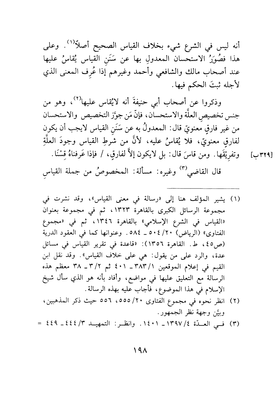 (¬١) يشير المؤلف هنا إلى "رسالة في معنى القياس"، وقد نشرت في مجموعة الرسائل الكبرى بالقاهرة ١٣٢٣، ثم في مجموعة بعنوان "القياس في الشرع الإسلامي" بالقاهرة ١٣٤٦، ثم في "مجموع الفتاوى" (الرياض) ٢٠/ ٥٠٤ - ٥٨٤. وعنوانها كما في العقود الدرية (ص ٤٥، ط. القاهرة ١٣٥٦): "قاعدة في تقرير القياس في مسائل عدة، والرد على من يقول: هي على خلاف القياس". وقد نقل ابن القيم في إعلام الموقعين ١/ ٣٨٣ - ٤٠١ ثم ٢/ ٣ - ٣٨ معظم هذه الرسالة مع التعليق عليها في مواضع، وأفاد بأنه هو الذي سال شيخ الإسلام في هذا الموضوع، فأجاب عليه بهذه الرسالة.