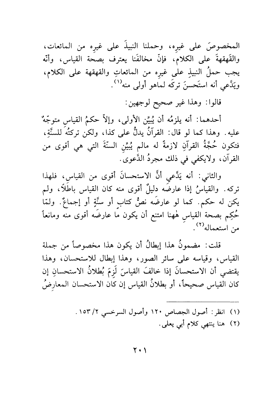 المخصوصَ على غيرِه، وحملنا النبيذَ على غيرِه من المائعات، والقَهقهةَ على الكلام، فإن مخالفَنا يعترف بصحة القياس، وأنّه يجب حملُ النبيذِ على غيرِه من المائعاتِ والقهقهة على الكلام، ويدَعي أنه استَحسنَ تركَه لما هو أولى منه (¬١).