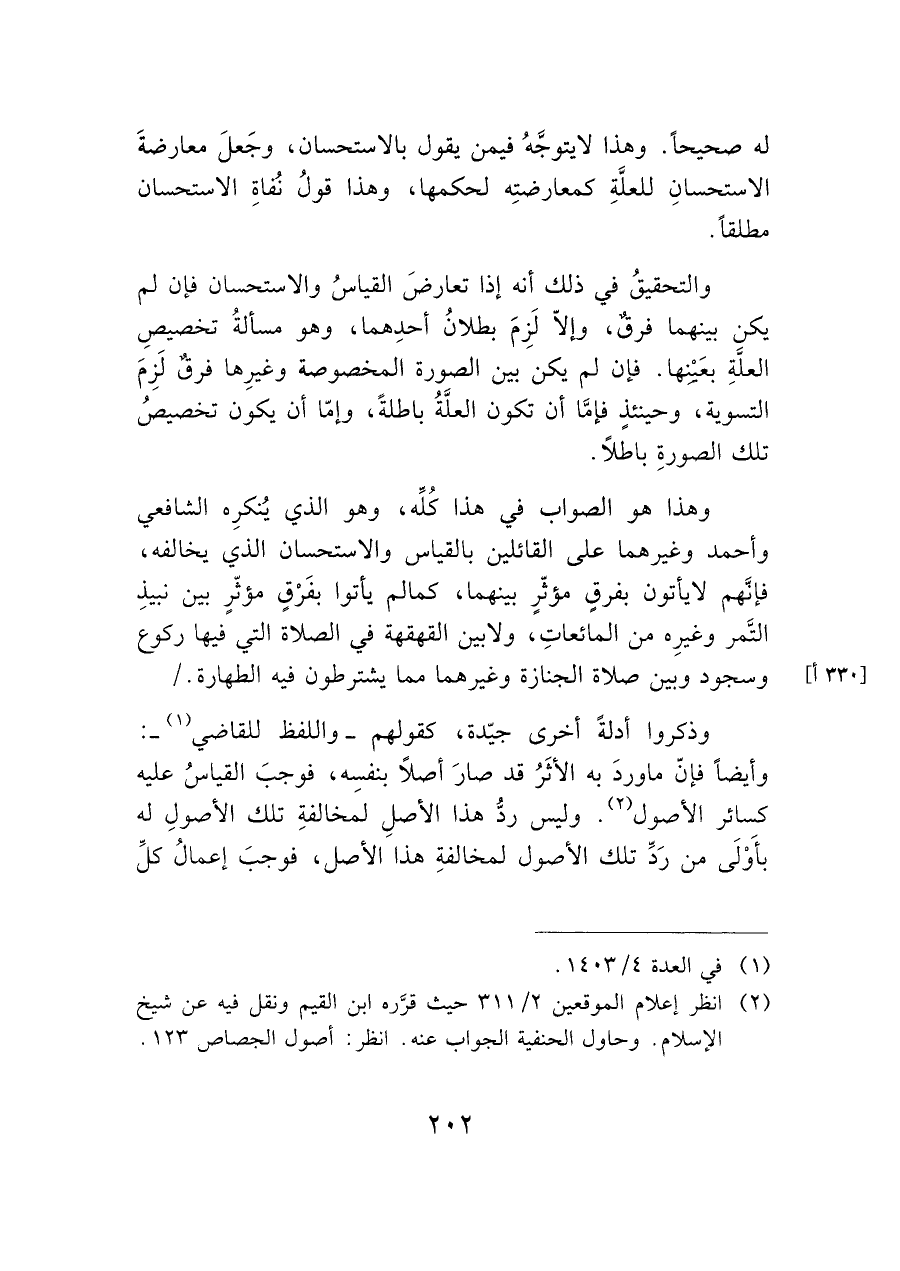 (¬٢) انظر إعلام الموقعين ٢/ ٣١١ حيث قرره ابن القيم ونقل فيه عن شيخ الإسلام. وحاول الحنفية الجواب عنه. انظر: أصول الجصاص ١٢٣.