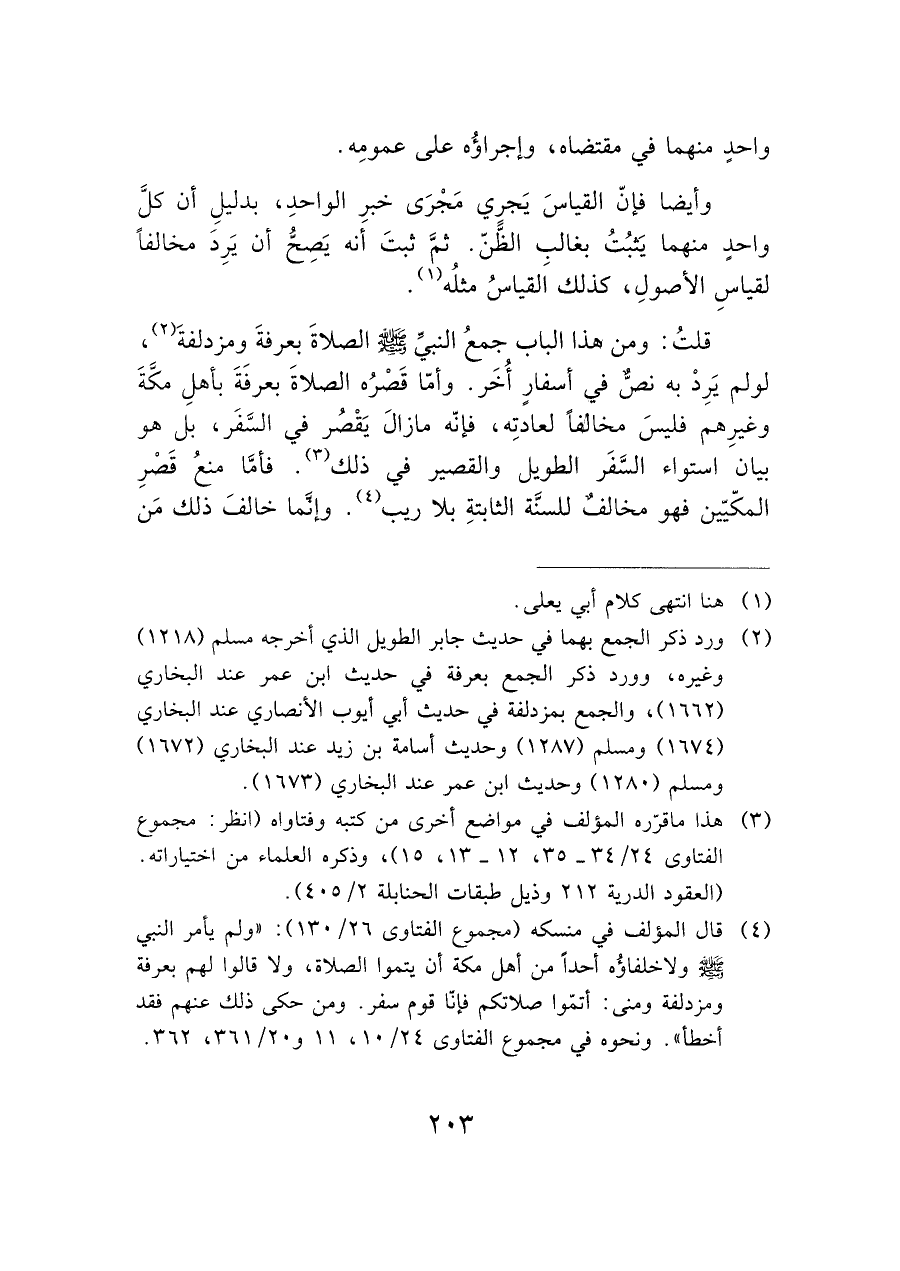 قلتُ: ومن هذا الباب جمعُ النبيِّ - صَلَّى اللَّهُ عَلَيْهِ وَسَلَّمَ - الصلاةَ بعرفةَ ومزدلفةَ (¬٢)، لو لم يَرِدْ به نصّ في أسفارٍ أُخَر. وأمّا قَصْرُه الصلاةَ بعرفَةَ بأهلِ مكَّةَ وغيرِهم فليسَ مخالفاً لعادتِه، فإنّه مازالَ يَقْصُر في السفَر، بل هو بيان استواء السَّفَر الطويل والقصير في ذلك (¬٣). فأمَّا منعُ قَصْرِ المكّيّين فهو مخالفٌ للسنة الثابتةِ بلا ريب (¬٤). وإنما خالفَ ذلك مَن