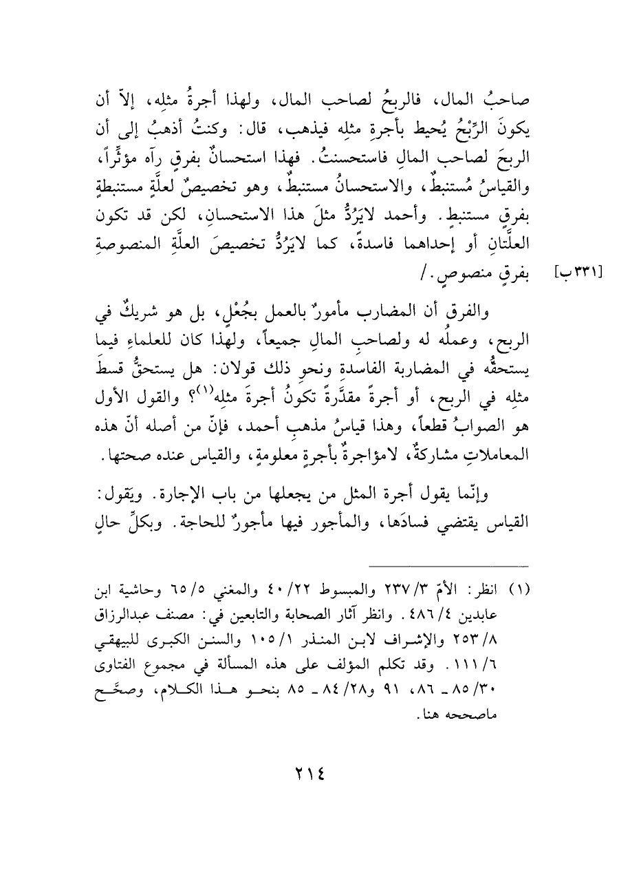 صاحبُ المال، فالربحُ لصاحب المال، ولهذا أجرةُ مثلِه، إلاّ أن يكونَ الرِّبْحُ يُحيط بأجرةِ مثلِه فيذهب، قال: وكنتُ أذهبُ إلى أن الربحَ لصاحب المالِ فاستحسنتُ. فهذا استحسان بفرقٍ رآه مؤثراً، والقياسُ مُستنبط، والاستحسانُ مستنبط، وهو تخصيصٌ لعلَّةٍ مستنبطةٍ بفرقٍ مستنبطٍ. وأحمد لا يَرُد مثلَ هذا الاستحسانِ، لكن قد تكون العفَتانِ أو إحداهما فاسدةً، كما لا يَرُدُّ تخصيصَ العلَّةِ المنصوصةِ بفرقٍ منصوصٍ./