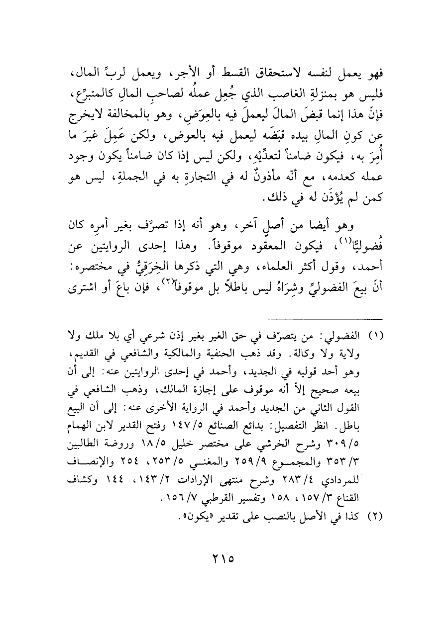 (¬١) الفضولي: من يتصرّف في حق الغير بغير إذن شرعي أي بلا ملك ولا ولاية ولا وكالة. وقد ذهب الحنفية والمالكية والشافعي في القديم، وهو أحد قوليه في الجديد، واْحمد في إحدى الروايتين عنه: إلى أن بيعه صحيح إلاّ أنه موقوف على إجازة المالك، وذهب الشافعي في القول الثاني من الجديد واْحمد في الرواية الأخرى عنه: إلى أن البيع باطل. انظر التفصيل: بدائع الصنائع ٥/ ١٤٧ وفتح القدير لابن الهمام ٥/ ٣٠٩ وشرح الخرشي على مختصر خليل ٥/ ١٨ وروضة الطالبين ٣/ ٣٥٣ والمجموع ٩/ ٢٥٩ والمغني ٥/ ٢٥٣، ٢٥٤ والإنصاف للمردادي ٤/ ٢٨٣ وشرح منتهى الإرادات ٢/ ١٤٣، ١٤٤ وكشاف القناع ٣/ ١٥٧، ١٥٨ وتفسير القرطبي ٧/ ١٥٦.