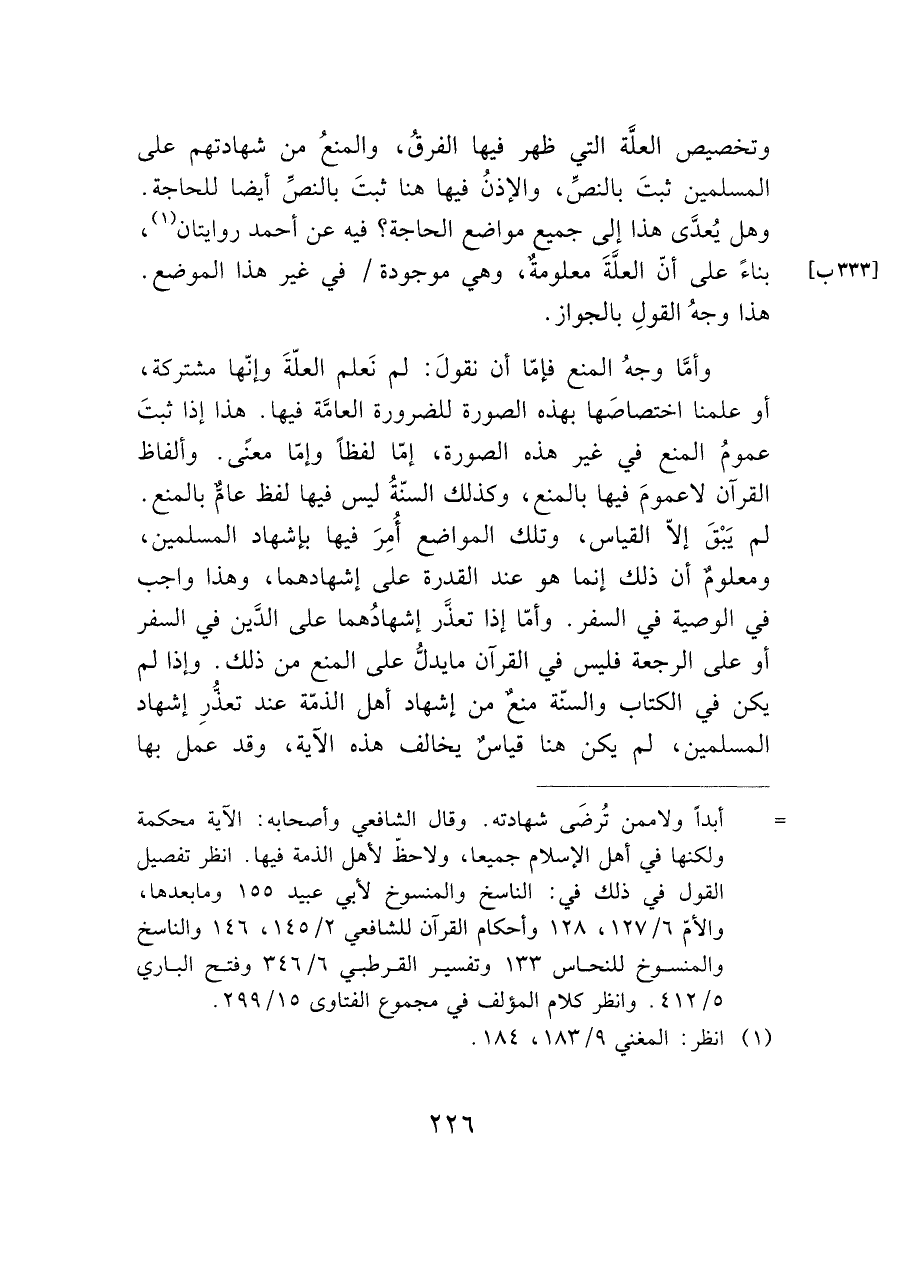 وأمَّا وجهُ المنع فإمّا أن نقولَ: لم نَعلم العلةَ وإنّها مشتركة، أو علمنا اختصاصَها بهذه الصورة للضرورة العامَّة فيها. هذا إذا ثبتَ عمومُ المنع في غير هذه الصورة، إمّا لفظاً وإمّا معنًى. وألفاظ القرآن لا عمومَ فيها بالمنع، وكذلك السنّةُ ليس فيها لفظ عامّ بالمنع. لم يَبْقَ إلاّ القياس، وتلك المواضع أُمِرَ فيها بإشهاد المسلمين، ومعلومٌ أن ذلك إنما هو عند القدرة على إشهادهما، وهذا واجب في الوصية في السفر. وأمّا إذا تعذَّر إشهادُهما على الذَين في السفر أو على الرجعة فليس في القرآن ما يدل على المنع من ذلك. وإذا لم يكن في الكتاب والسنّة منعٌ من إشهاد أهل الذمّة عند تعذُّرِ إشهاد المسلمين، لم يكن هنا قياسٌ يخالف هذه الآية، وقد عمل بها