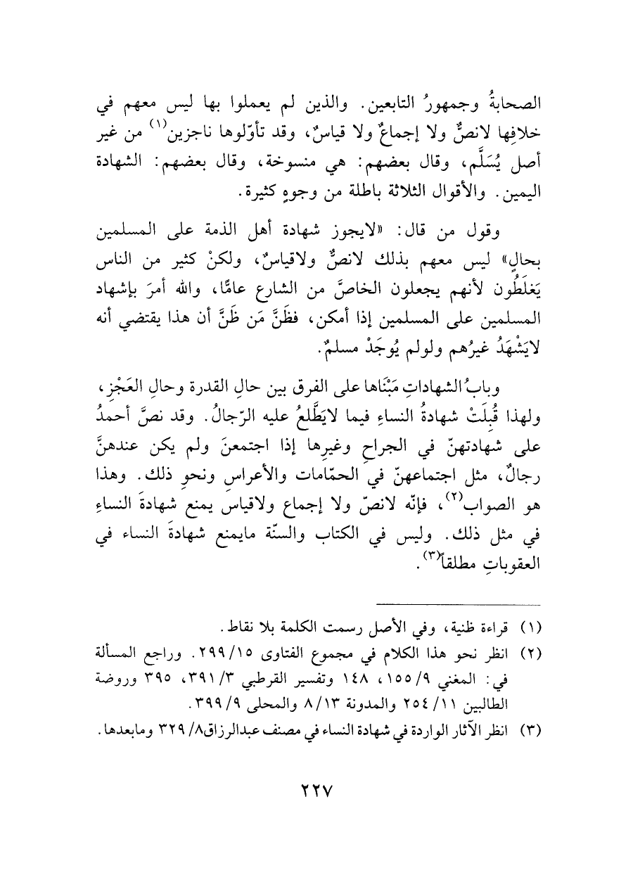 (¬٢) انظر نحو هذا الكلام في مجموع الفتاوى ١٥/ ٢٩٩. وراجع المسألة في: المغني ٩/ ١٥٥، ١٤٨ وتفسير القرطبي ٣/ ٣٩١. ٣٩٥ وروضة الطالبين ١١/ ٢٥٤ والمدونة ٨/ ١٣ والمحلى ٩/ ٣٩٩.