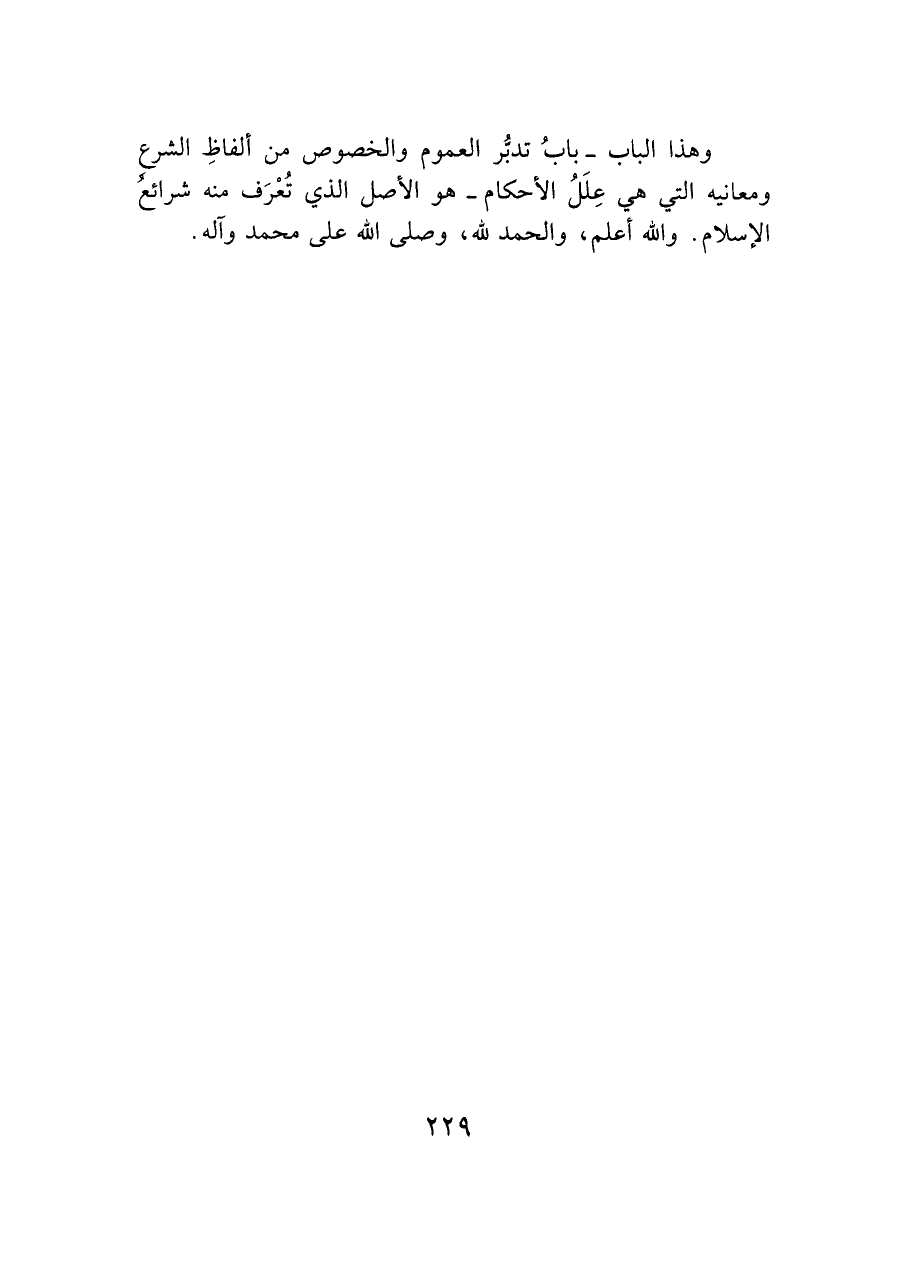 وهذا الباب- بابُ تدبر العموم والخصوص من ألفاظِ الشرع ومعانيه التي هي عِلَلُ الأحكام- هو الأصل الذي تُعْرَف منه شرائع الإسلام. والله أعلم، والحمد لله، وصلى الله على محمد وآله.